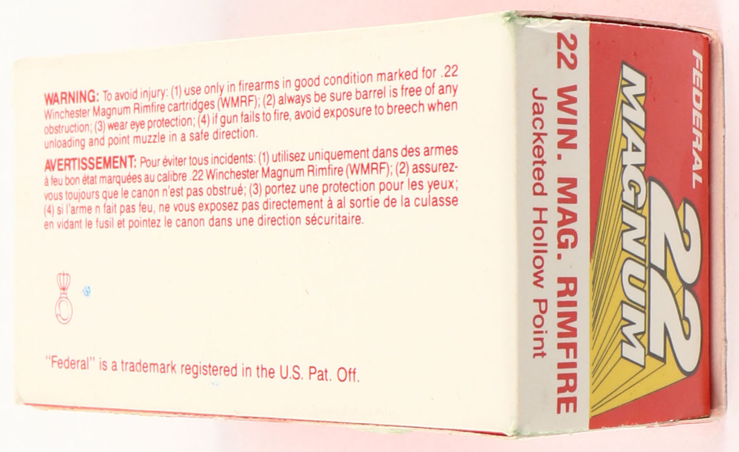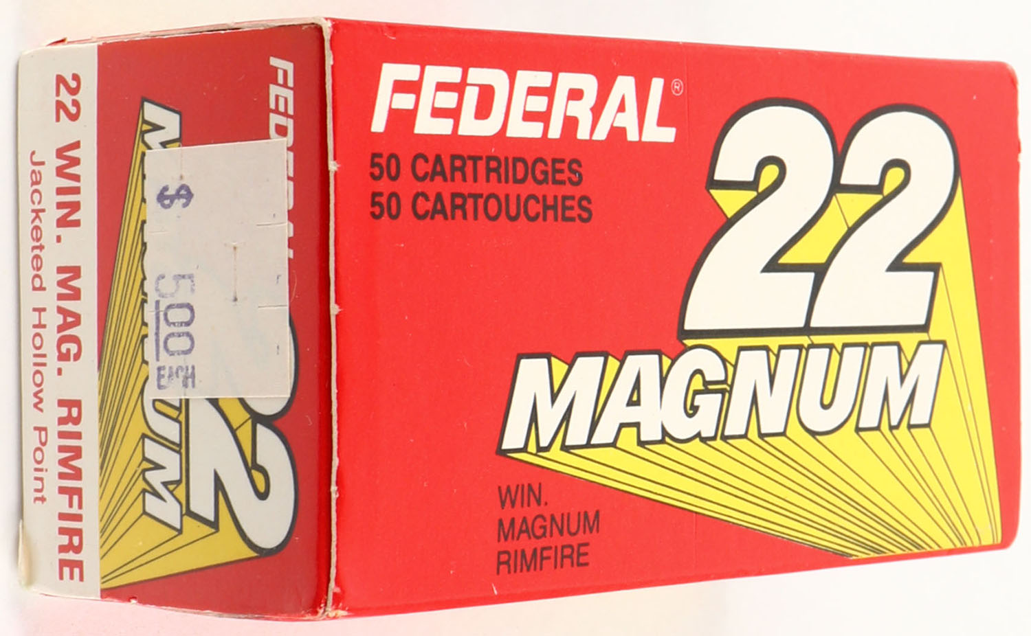 Federal, 22 Magnum, .22 Winchester Magnum, Jacketed Hollow Point, RHWeb: FED-17 WMR-5a, Full, 1pc. Red white & yellow box, box is MINT with mint color, corners are sharp, edges are crisp, end flaps are solid, ammo is minty. Grade: MINT - Value: 10 to 40