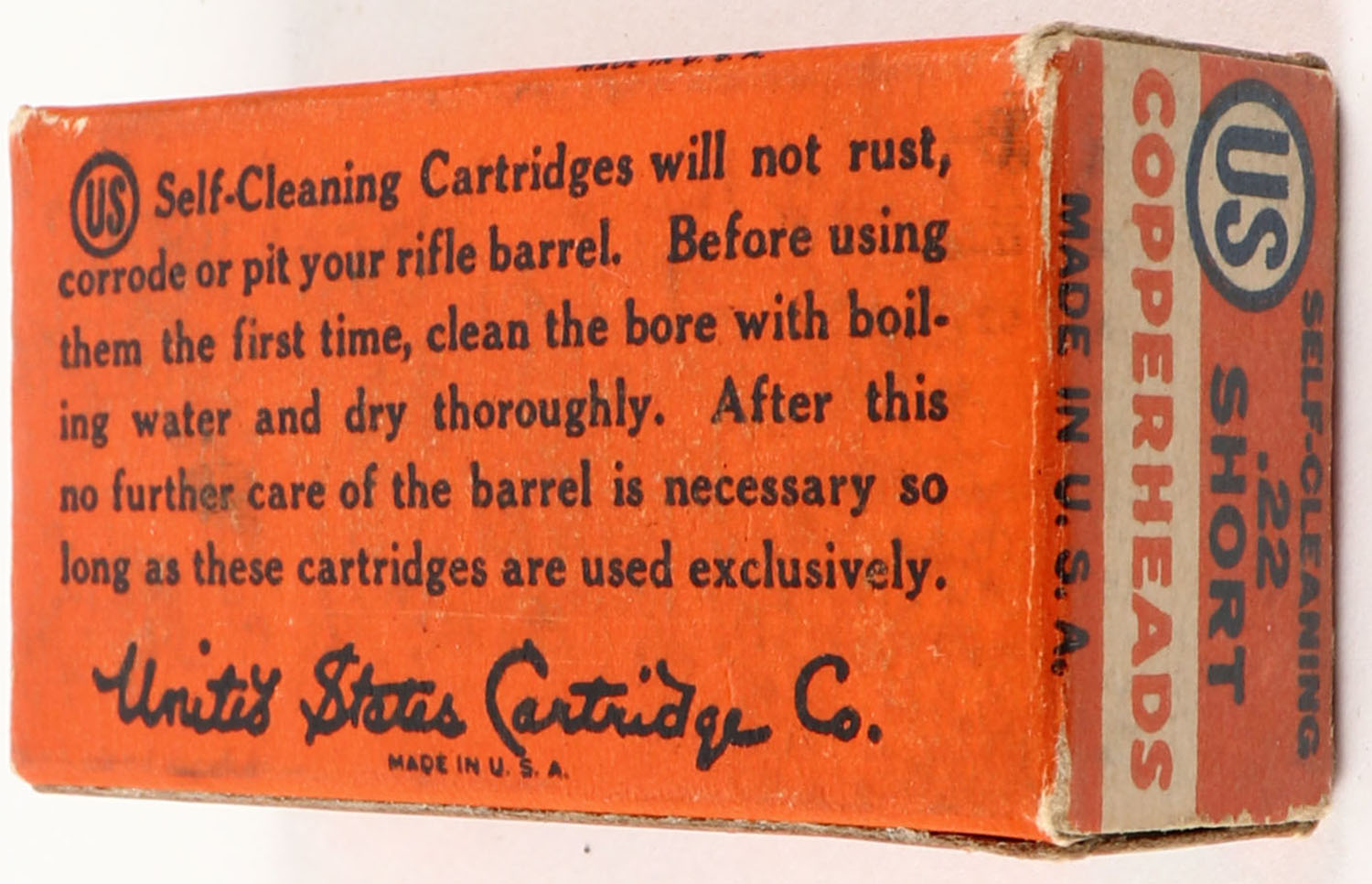 U.S., Copperheads, .22 Short, Self-Cleaning, RHWeb: US-12 S-1a, Partial 49rds., 1pc. Orange white & blue box, box is solid with very good color, minor age soiling, very minor edge & corner wear, end flaps are solid, ammo is very good. Grade: Very Good ++ - Value: 30 to 90
