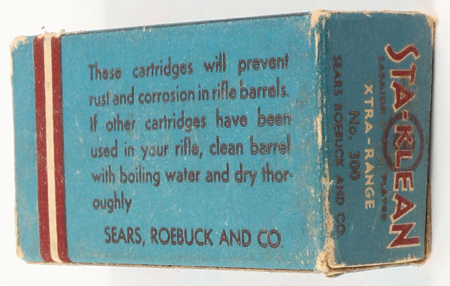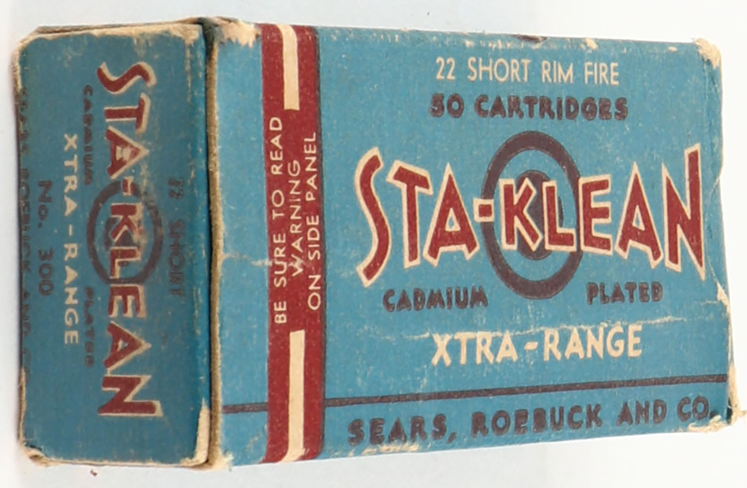 Sears, Sta-Klean, .22 Short, Cadmium Plated, SEARS-4 S-1a, Full, 1pc. Blue brick & white box, box is solid with excellent color, minor age soiling, corner wear, some edge wear, end flaps are solid, ammo is excellent. Grade: Very Good ++ - Value: 10 to 50