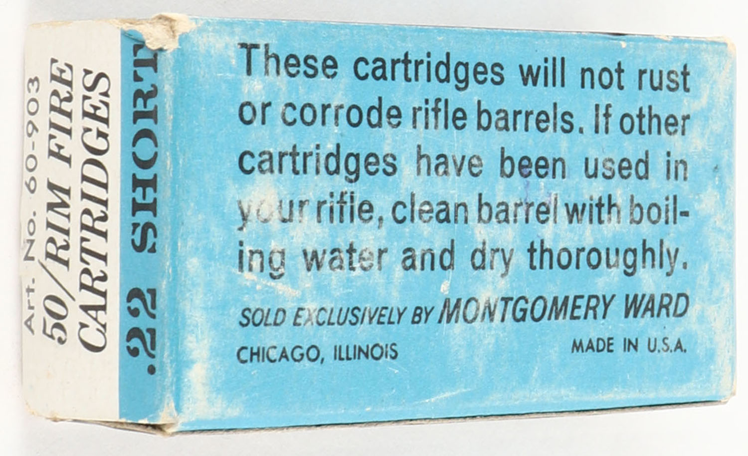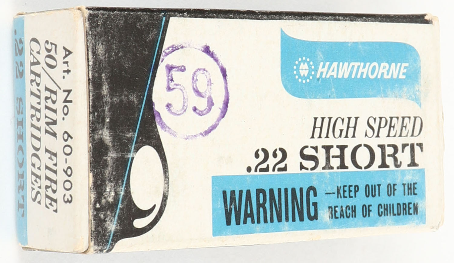Wards, Hawthorne High Speed, .22 Short, RHWeb: MW-7 S-1b, Full, 1pc. White black & blue box with '59' Stamp on top, box is solid with very good color, very minor age soiling, minor shelf wear, very minor corner wear, edges are crisp, end flaps are solid, ammo is very good. Grade: Very Good + - Value: 8 to 40