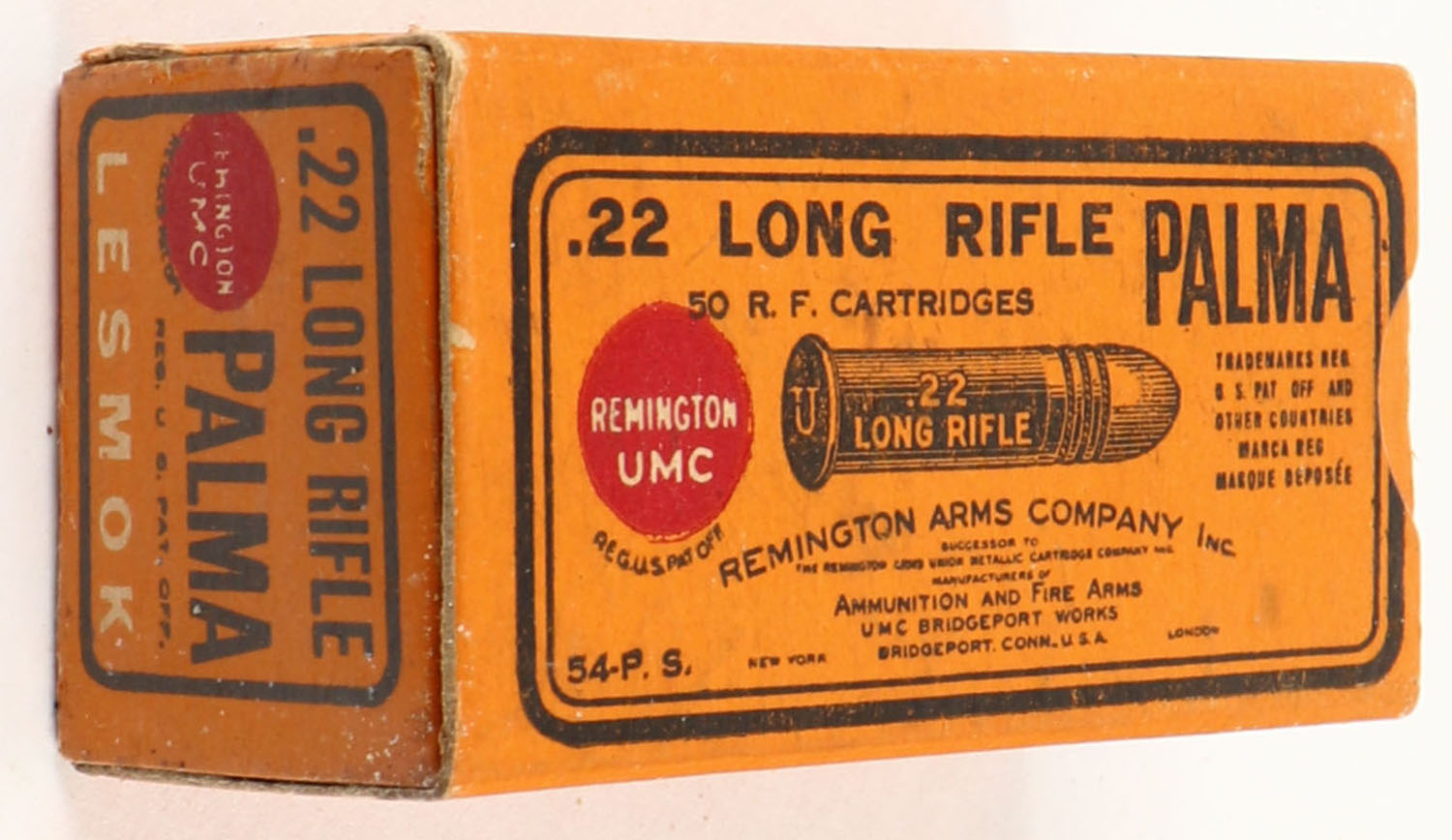 REM-UMC, Palma, .22 Long Rifle, Lesmok, RHWeb: REM-52 LR-1b, Full, 1pc. Orange black & red box, box is solid with excellent color, very minor corner wear, edges are crisp, end flaps are solid, ammo is good. Grade: Excellent ++ - Value: 40 to 120