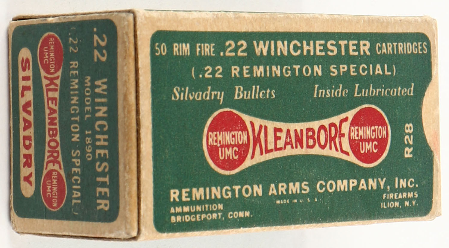 Remington, Silvadry Kleanbore, .22 Winchester (.22 Remington Special), inside lubricated, RHWeb: REM-7.3 WRF-1a, Full, 1pc. Green buff & red dog bone box, box is solid with excellent color, very minor corner wear, edges are crisp, end flaps are solid, ammo is excellent. Grade: Excellent + - Value: 60 to 240