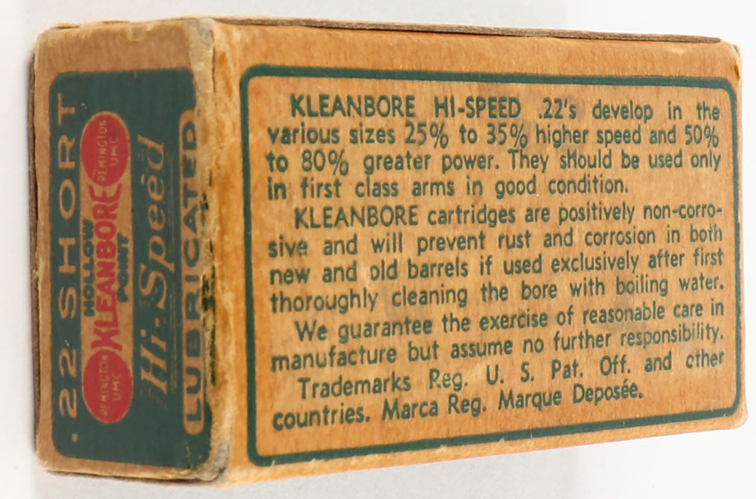 Remington, Hi-Speed Kleanbore, .22 Short Hollow Point, RHWeb: REM-7.4 S-2f, Full, 1pc. Green buff & red dog bone box, box is solid with very good color, age soiling, very minor corner wear, edges are crisp, end flaps are solid, ammo is excellent. Grade: Very Good ++ - Value: 20 to 60