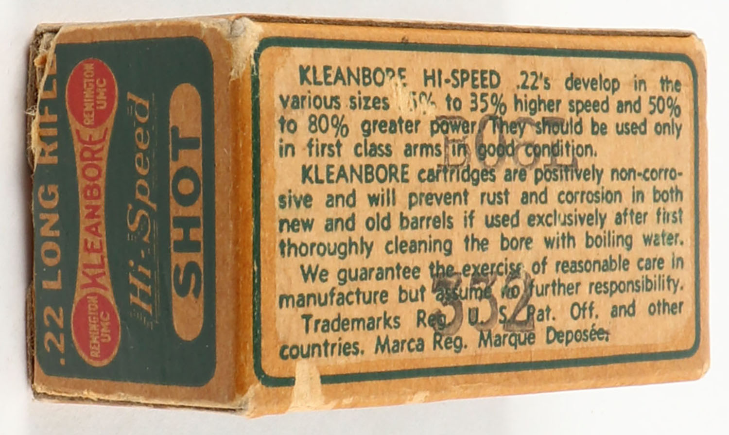 Remington, Hi-Speed Kleanbore, .22 Long Rifle Shot, RHWeb: REM-7.4 LR-4c, Full, 1pc. Green buff & red dog bone box, box is solid with very good to excellent color, minor age soiling, some corner wear, edges are crisp, end flaps are solid, ammo is excellent. Grade: Excellent - Value: 10 to 50