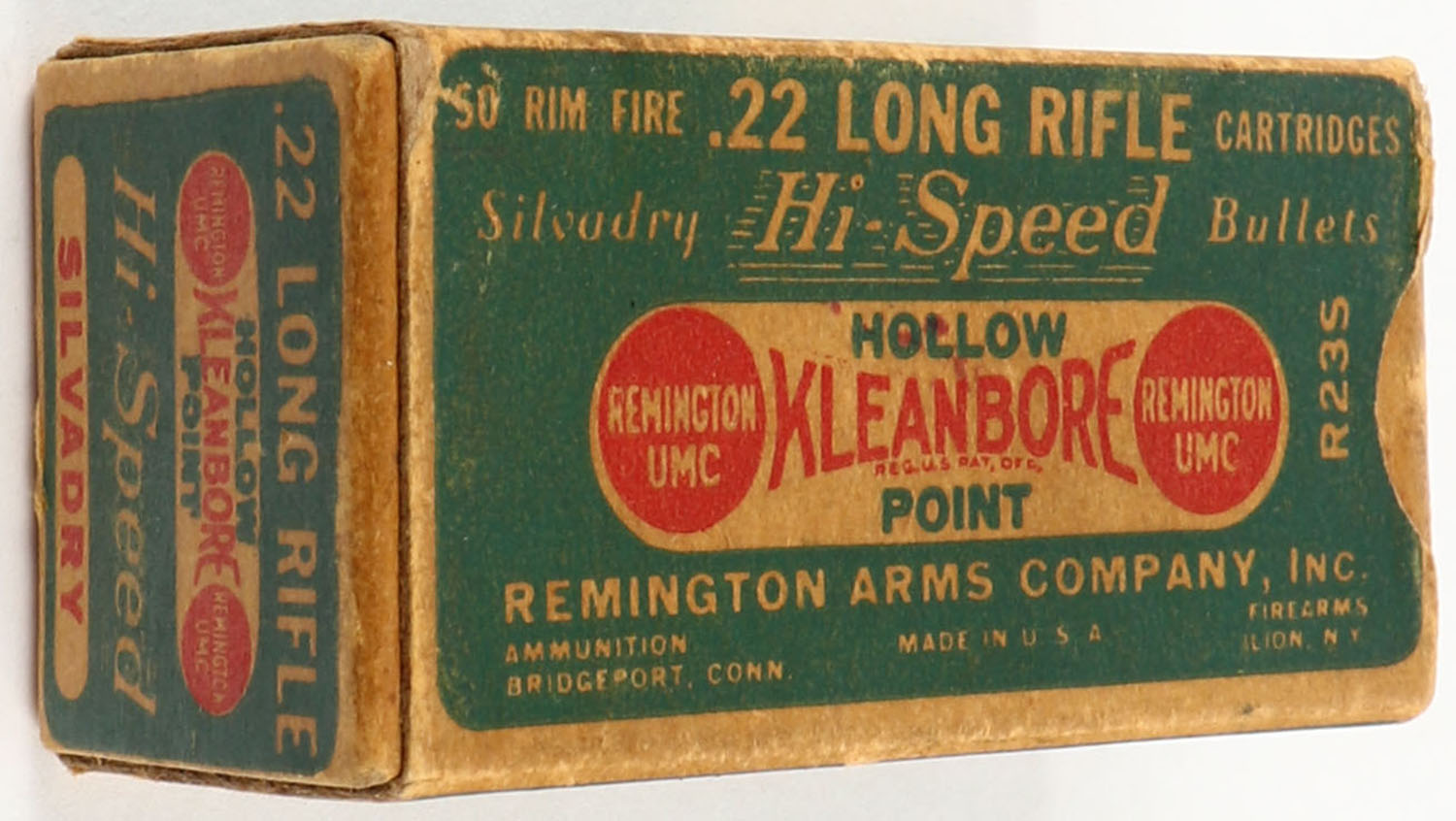 Remington, Silvadry Hi-Speed Silvadry, .22 Long Rifle Hollow Point, RHWeb: REM-7.5 LR-1d, Full, 1pc. Green buff & red dog bone box, box is solid with very good color, age soiling, minor corner wear, edges are mostly crisp, end flaps are solid, ammo is excellent. Grade: Very Good ++ - Value: 30 to 90