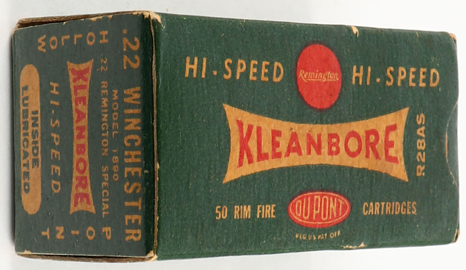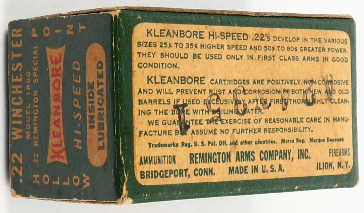 Remington, Kleanbore Hi-Speed, .22 Winchester Rim Fire Hollow Point, RHWeb: REM-9 WRF-2a, Full, 1pc. Green buff & red box, box is solid with very good color, some age soiling, very minor edge & corner wear, end flaps are solid, ammo is excellent. Grade: Excellent - Value: 20 to 60