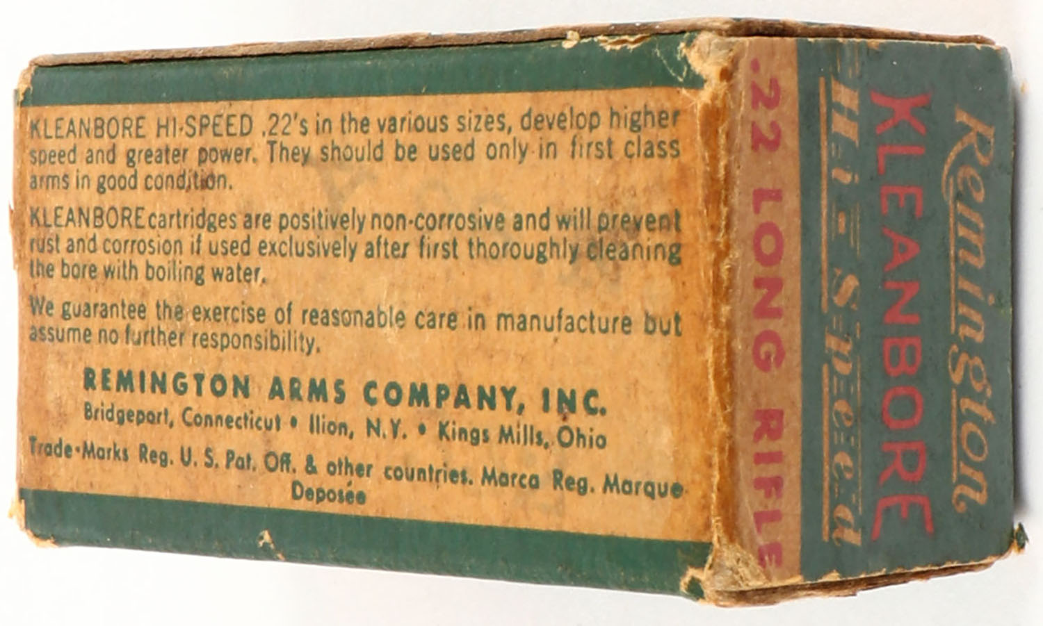 Remington, Kleanbore Hi-Speed, .22 Long Rifle, RHWeb: REM-10 LR-1b, Full, 1pc. Green buff & red box, box is solid with very good color, some age soiling & corner wear, very minor edge wear, end flaps are solid, ammo is excellent. Grade: Excellent - Value: 6 to 30