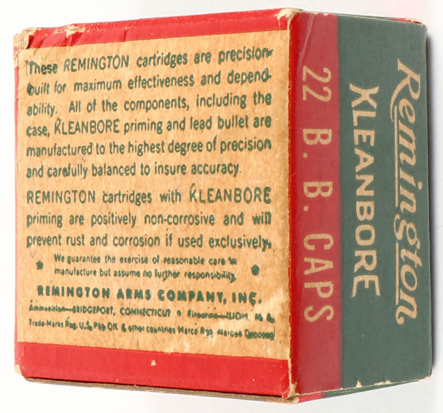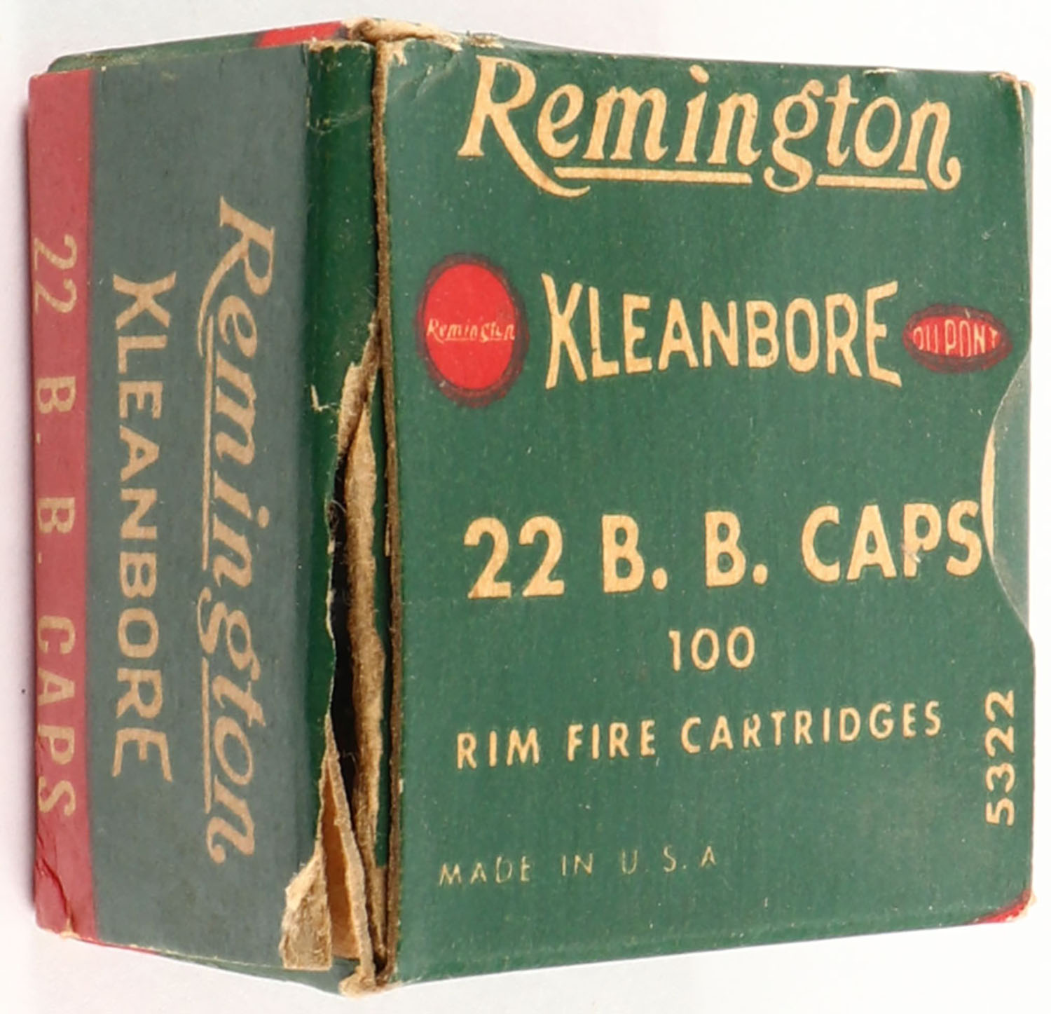 Remington, Kleanbore, .22 B.B. Caps, RHWeb: REM-12 BB-1b, Full, 1pc. Green buff & red box, insert tab of left end flap is almost completely torn, excellent color, minor age soiling, very minor corner wear, edges are crisp, right end flap is solid, ammo is excellent. Grade: Very Good ++ - Value: 20 to 60