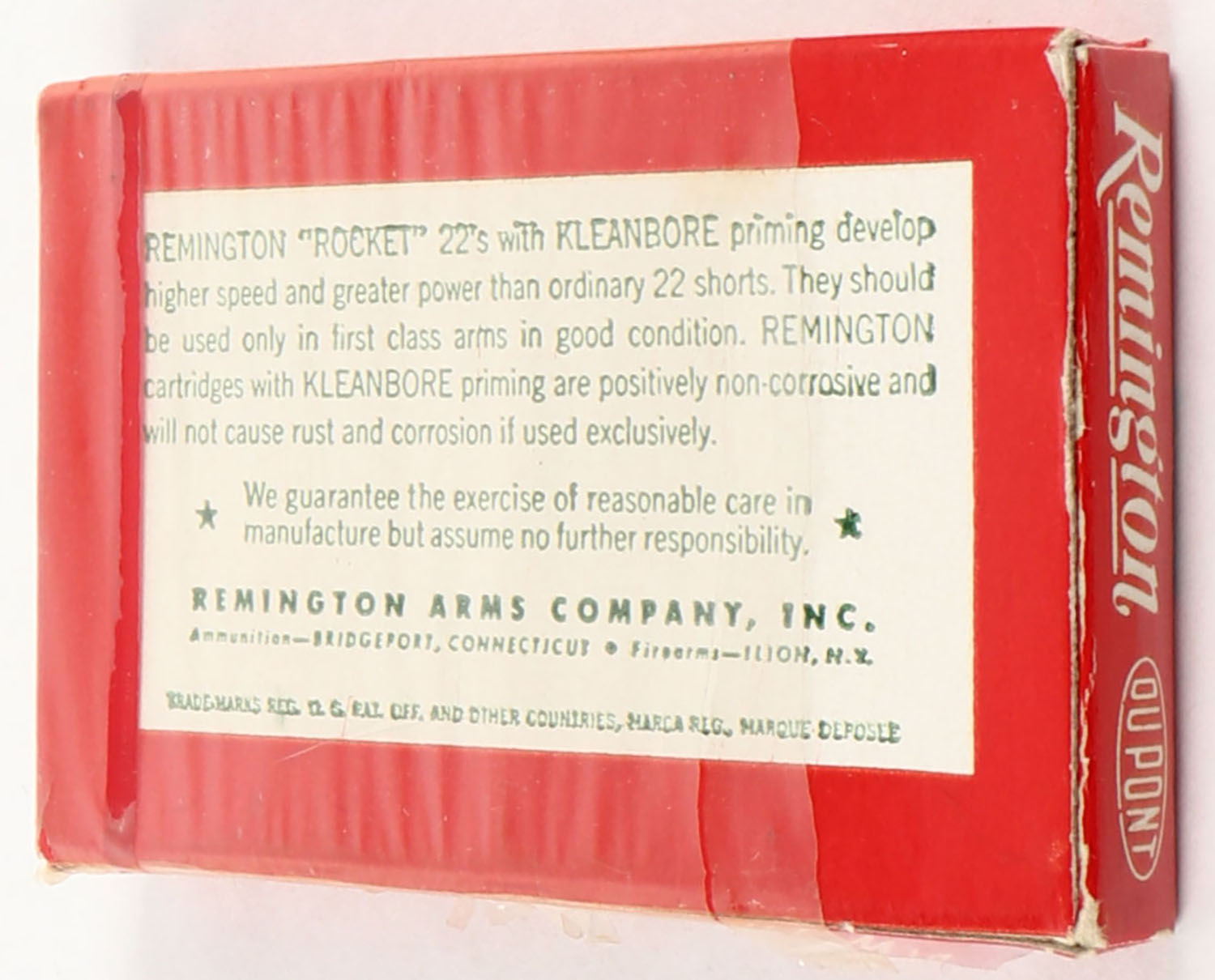 Remington, ''Rocket'', .22 Short, RHWeb: REM-14 S-5, Full & partially sealed (right end of plastic wrap is open), 1pc. Red green & white box, box is MINT with minty color, corners are sharp, edges are crisp, ammo appears minty. Grade: MINT - Value: 30 to 90