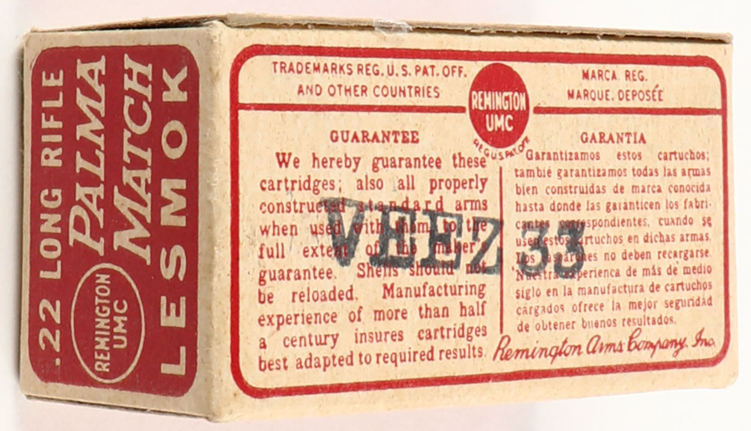 Remington, Palma Match, .22 Long Rifle, RHWeb: REM-52 LR-4, Full, 1pc. Red & buff box, box is solid with excellent color, very minor staining on top, corners are sharp, edges are crisp, end flaps are solid, ammo is very good. Grade: Excellent + - Value: 10 to 50