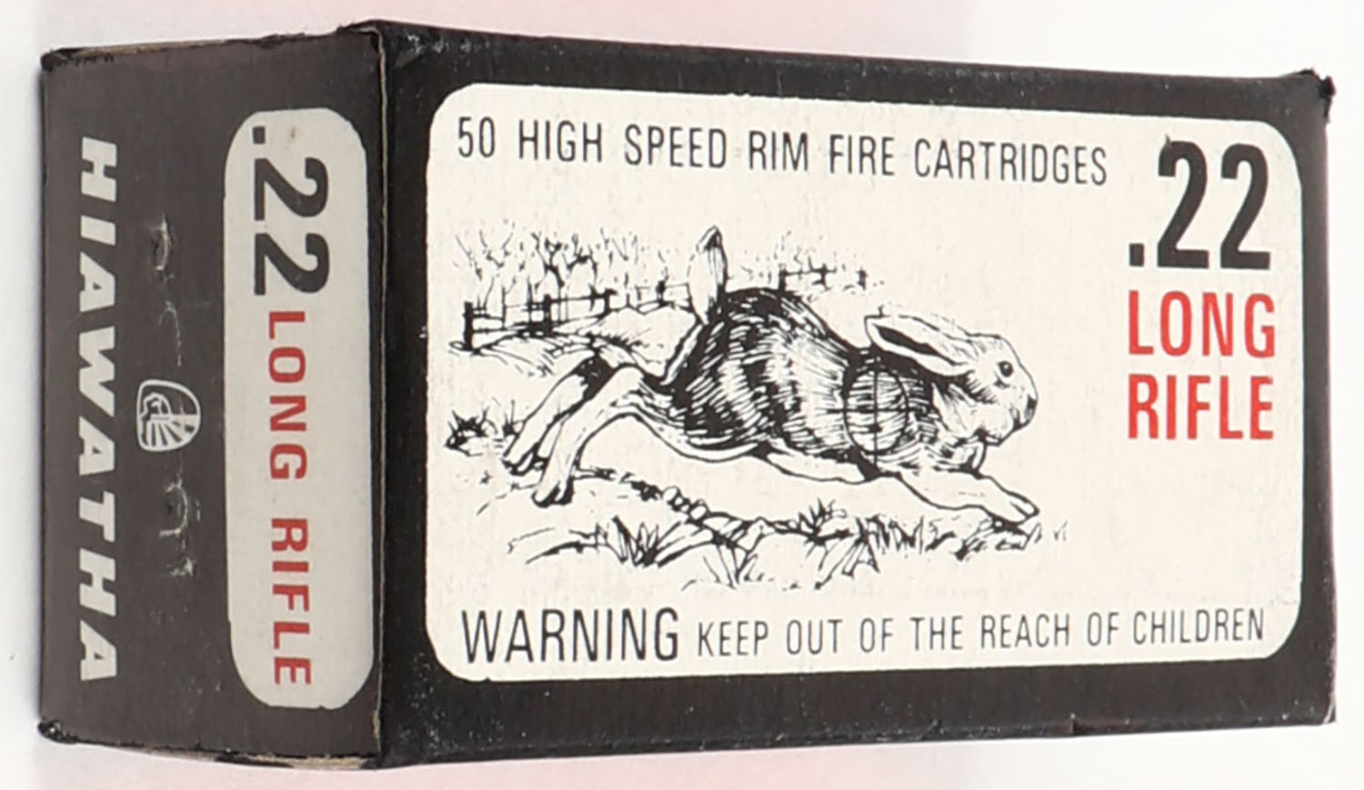 Gambles, Hiawatha, .22 Long Rifle, RHWeb: GS-5 LR-1a, Full, 1pc. White black & red box, box is solid with excellent color, very minor corner wear, edges are crisp, end flaps are solid, ammo is excellent to minty. Grade: Excellent ++ - Value: 40 to 120