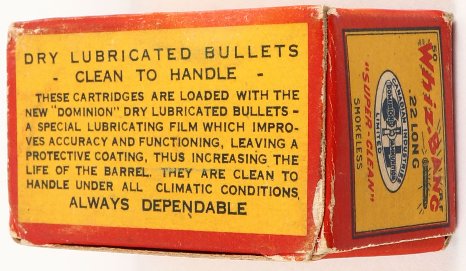 C.I.L., Whiz-Bang, .22 Long, Dry Lubricated Bullets, RHWeb: (Canada) CIL-2 L-3b, Full, 1pc. Red yellow & blue box, box is solid with excellent color, staining & color fading on front, minor corner wear, edges are crisp, top flap is solid, ammo is excellent. Grade: Excellent - Value: 20 to 60