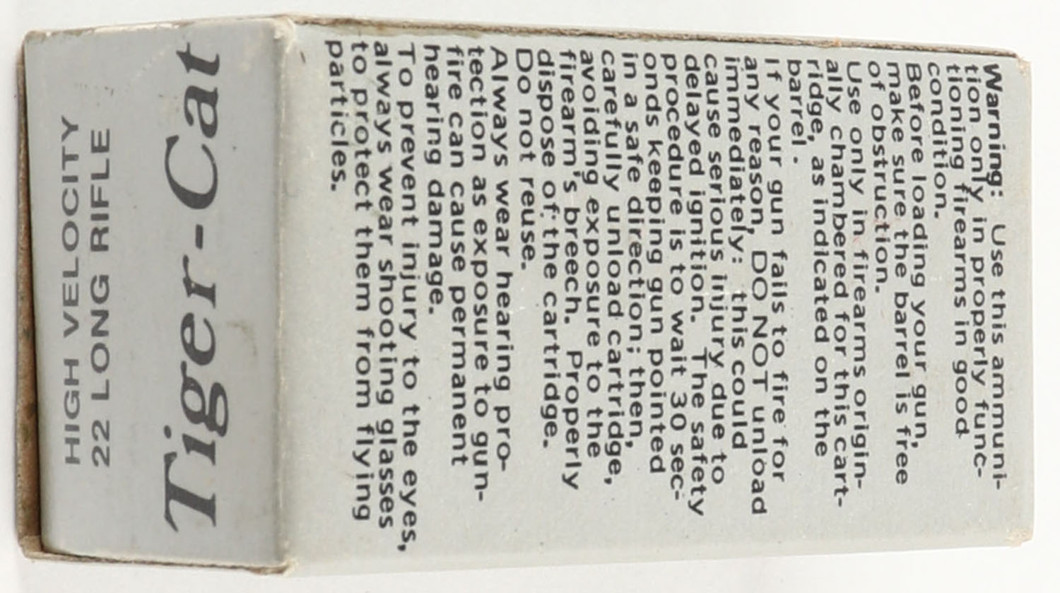 Sovereign, Tiger-Cat, .22 Long Rifle, High Velocity, RHWeb: SGD-1 LR-1a, Full, 1pc. Silver & black box, box is near mint with minty color, only very minor corner wear, edges are crisp, end flaps are solid, ammo is excellent to minty. Grade: Excellent ++ - Value: 16 to 60