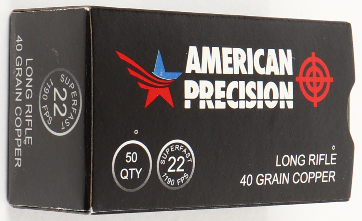 American Precision, Superfast, .22 Long Rifle, 40 Grain Copper, RHWeb: (Mexico) MEX-CCI-7 LR-2, Full, 1pc. Black box with white red & blue printing, box is MINT with minty color, corners are sharp, edges are crisp, end flaps are solid, ammo is minty. Grade: MINT - Value: 10 to 50