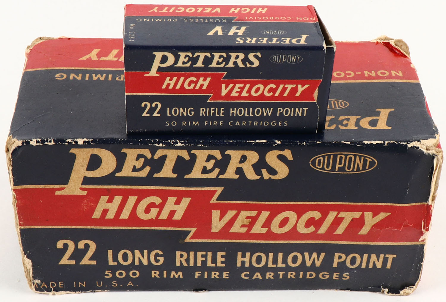 Peters, High Velocity, .22 Long Rifle Hollow Point, Partial 7 boxes, 1pc. Blue red & white brick, brick is missing both end flaps very good color, some age soiling, edge & corner wear, inside boxes are minty. Grade: Good - Value: 50 to 150