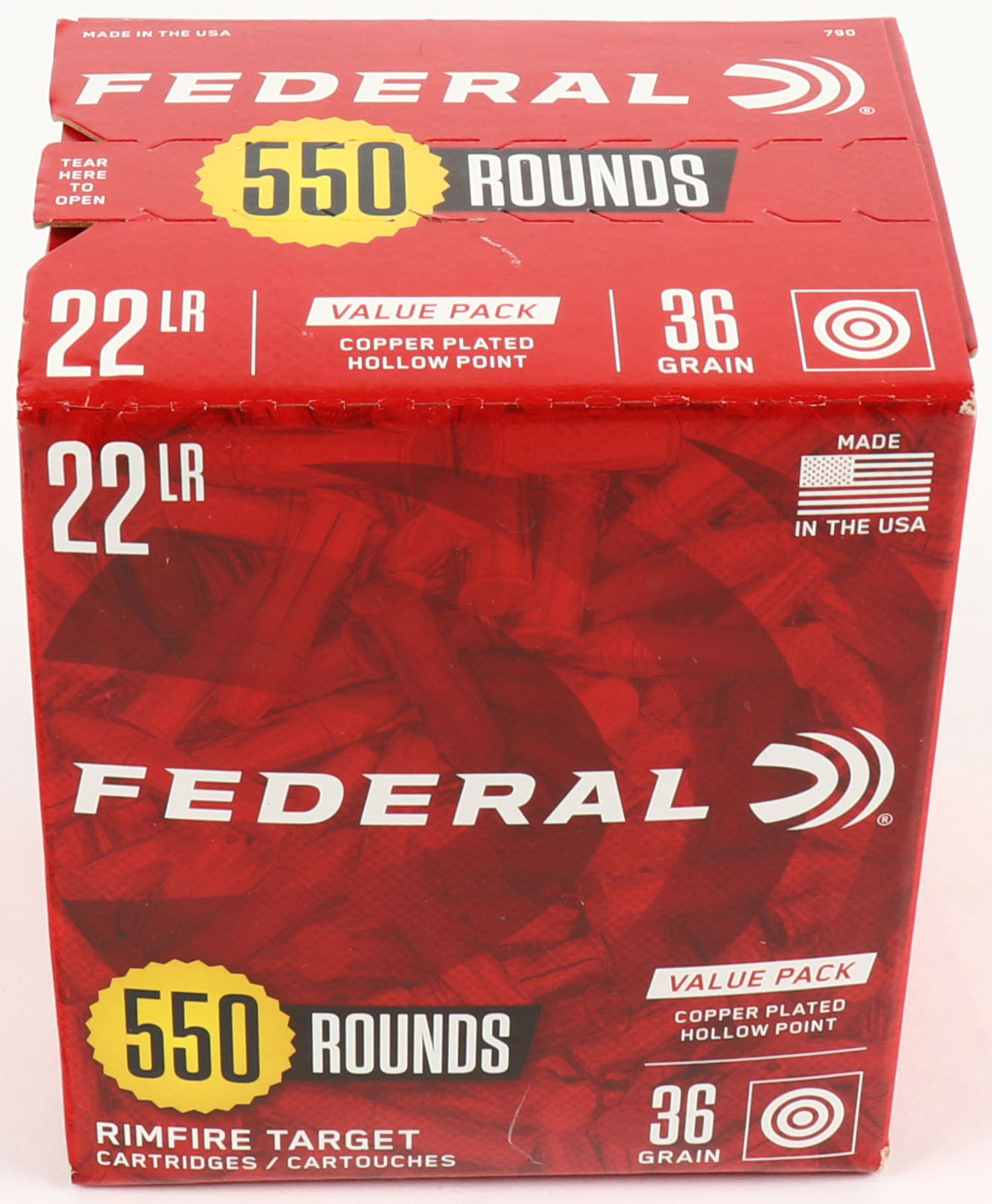Federal, Value Pack, .22 Long Rifle, 36 Grain Copper Plated Hollow Point, FULL & SEALED, 550rds., 1pc. Red bulk box, box is MINT with minty color, corners are sharp, edges are crisp. Grade: MINT - Value: 10 to 50