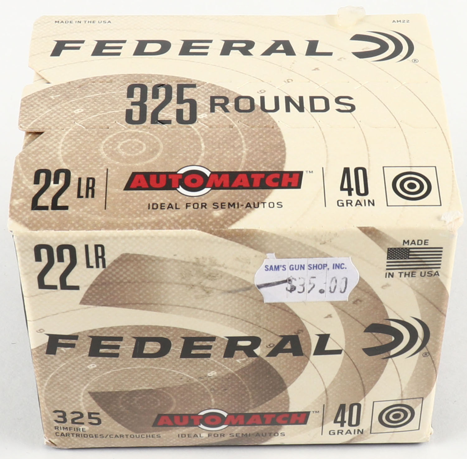 Federal, AutoMatch, .22 Long Rifle, Ideal for Semi-Autos, 40 Grain Solid, 1200 FPS, FULL & SEALED 325 rds. 1pc. Tan & black bulk box, box is near mint with minty color, very corner wear, edges are crisp. Grade: Excellent ++ - Value: 10 to 50