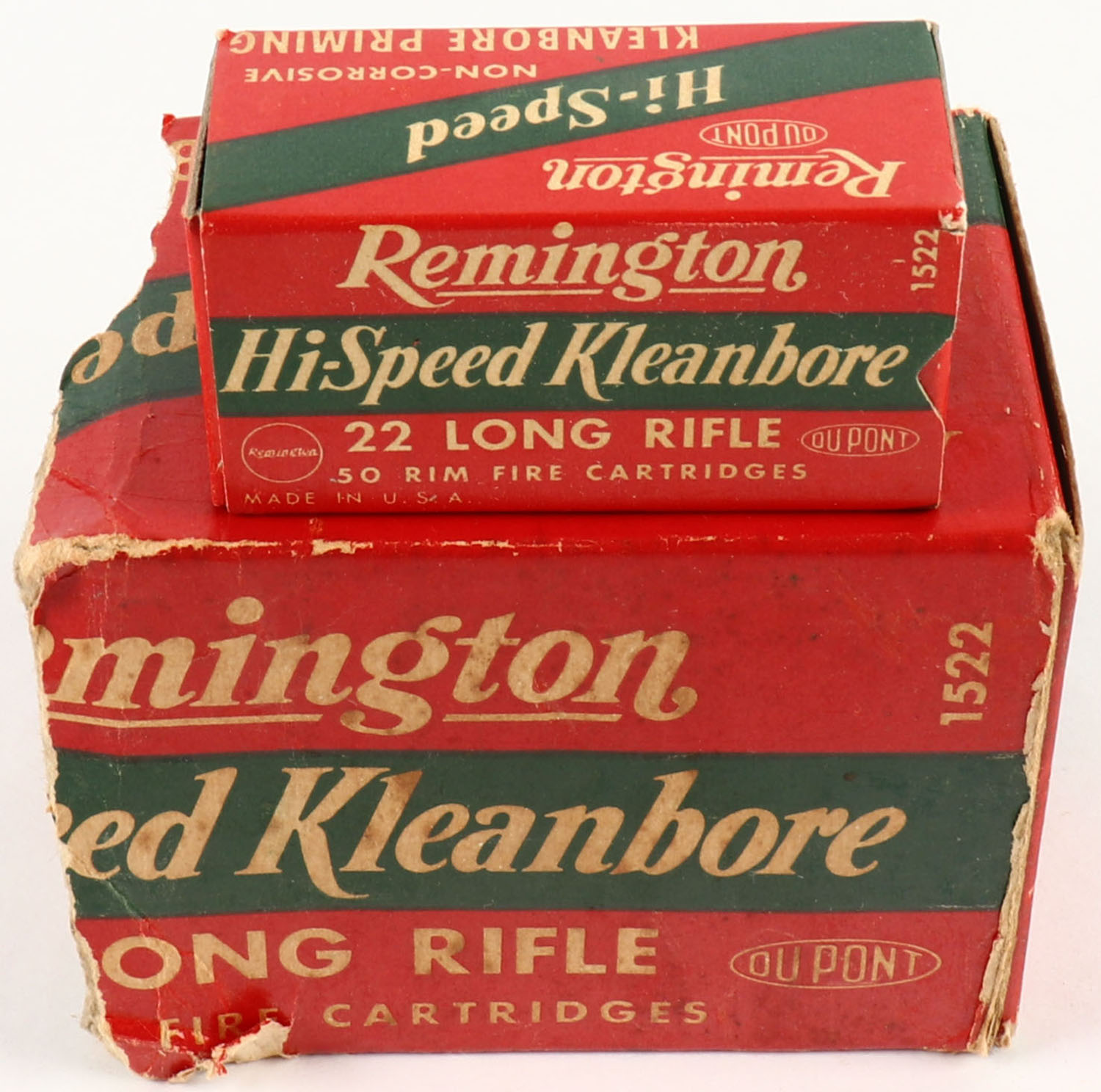 Remington, Hi-Speed Kleanbore, .22 Long Rifle, Partial 6 boxes, 1pc. Red green & white brick, brick is torn at the 6 box point, very good color, some age soiling & corner wear, right end flap is solid, inside boxes are minty. Grade: Fair - Value: 10 to 40