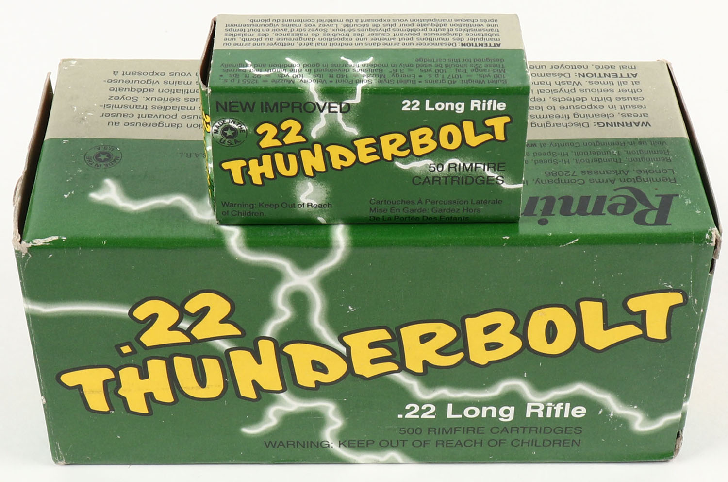 Remington, 22 Thunderbolt, .22 Long Rifle, Hi-Speed, Full, 500rds. 1pc. Green gray & yellow brick, brick is solid with minty color, very minor shelf wear, some corner wear, edges are mostly crisp, end flaps are solid, inside boxes are minty. Grade: Excellent + - Value: 20 to 60