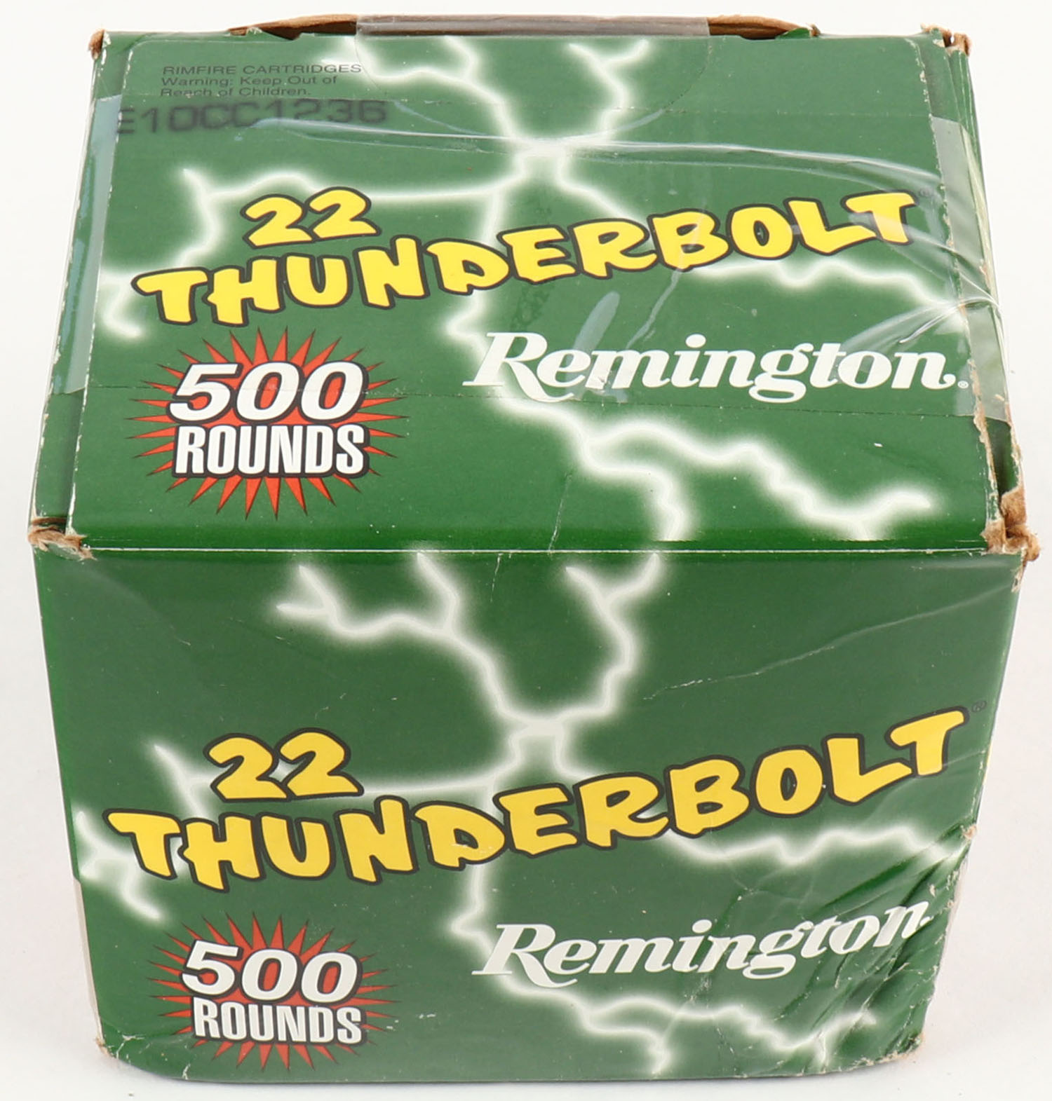 Remington, 22 Thunderbolt, .22 Long Rifle, High Velocity, Round Nose, FULL & SEALED, 500rds. 1pc. Green yellow & white bulk box, box is solid with minty color, tape going around box, some edge & corner wear. Grade: Excellent - Value: 10 to 40