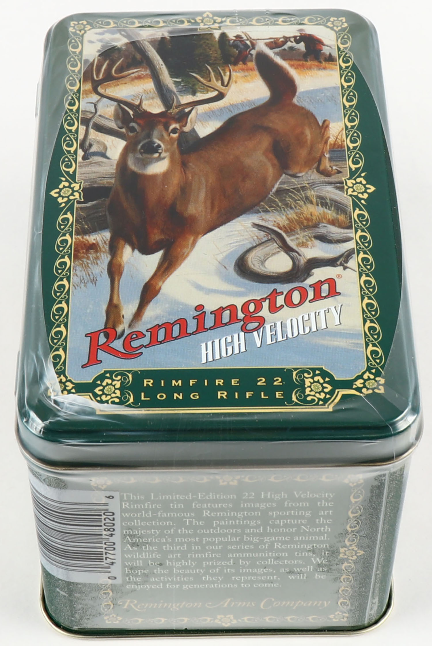 Remington, Limited Edition Collectors Tin, .22 Long Rifle, High Velocity, 1pc. FULL & SEALED, 400rds. Hinged tin features buck in a winter meadow. Grade: MINT - Value: 50 to 150