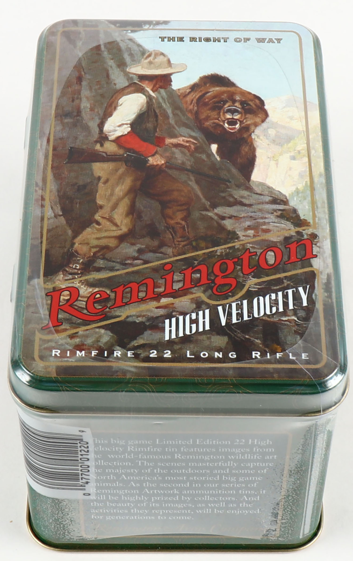 Remington, Limited Edition Collectors Tin, .22 Long Rifle, High Velocity, 1pc. FULL & SEALED, 400rds. Hinged tin features ''The Right of Way'' Classic Remington advertisement artwork. Grade: MINT - Value: 40 to 120