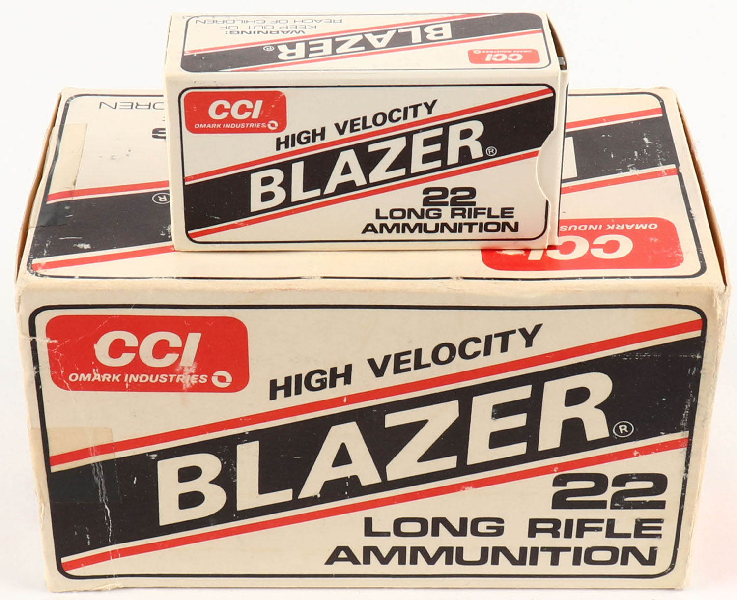 CCi, Blazer, .22 Long Rifle, High Velocity, Full, 500rds. 1pc. White black & red brick, brick is solid with excellent color, some shelf wear, tape on both ends, minor edge & corner wear, end flaps are solid, inside boxes are minty. Grade: Excellent - Value: 20 to 80