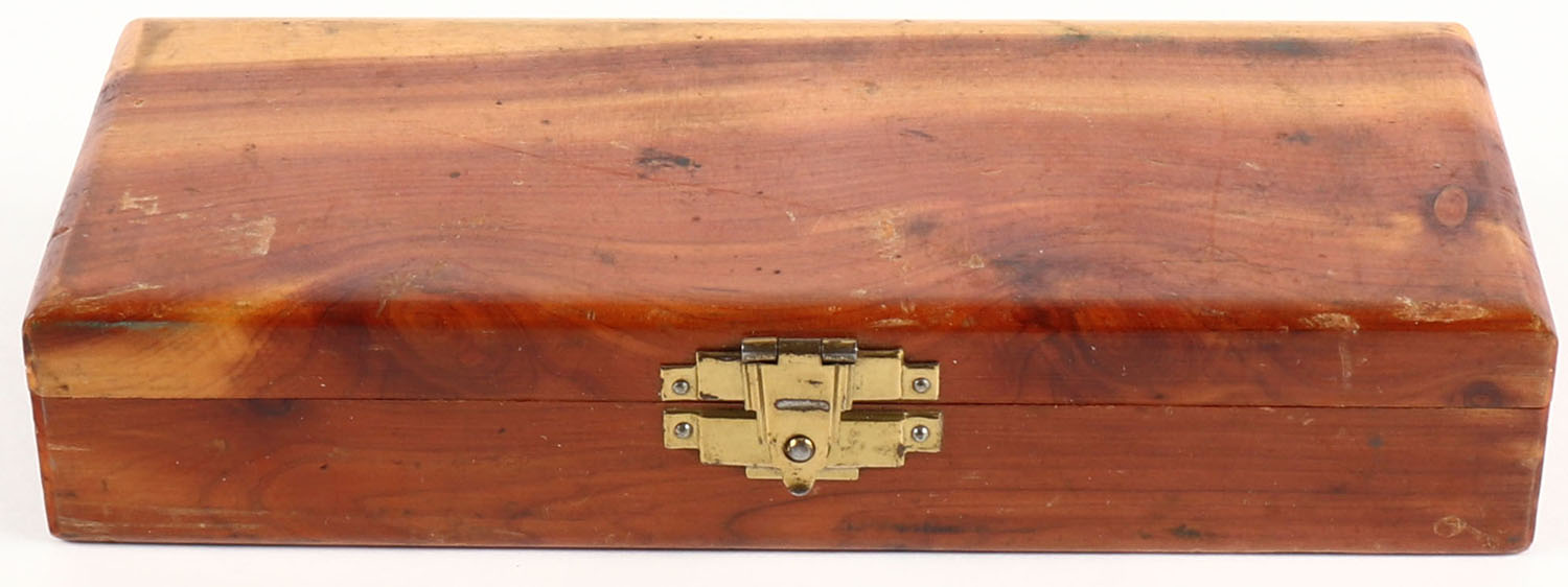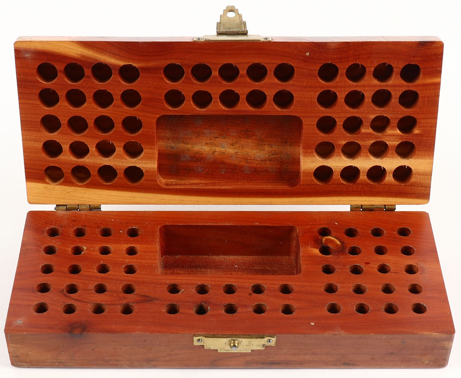 Unknown Mfg., Camp Perry Style box, very nice stained wood with brass latch, notches for 90 rounds & 50rd. .22 box, some wear to outside, inside is excellent. Grade: Very Good ++ - Value: 30 to 120