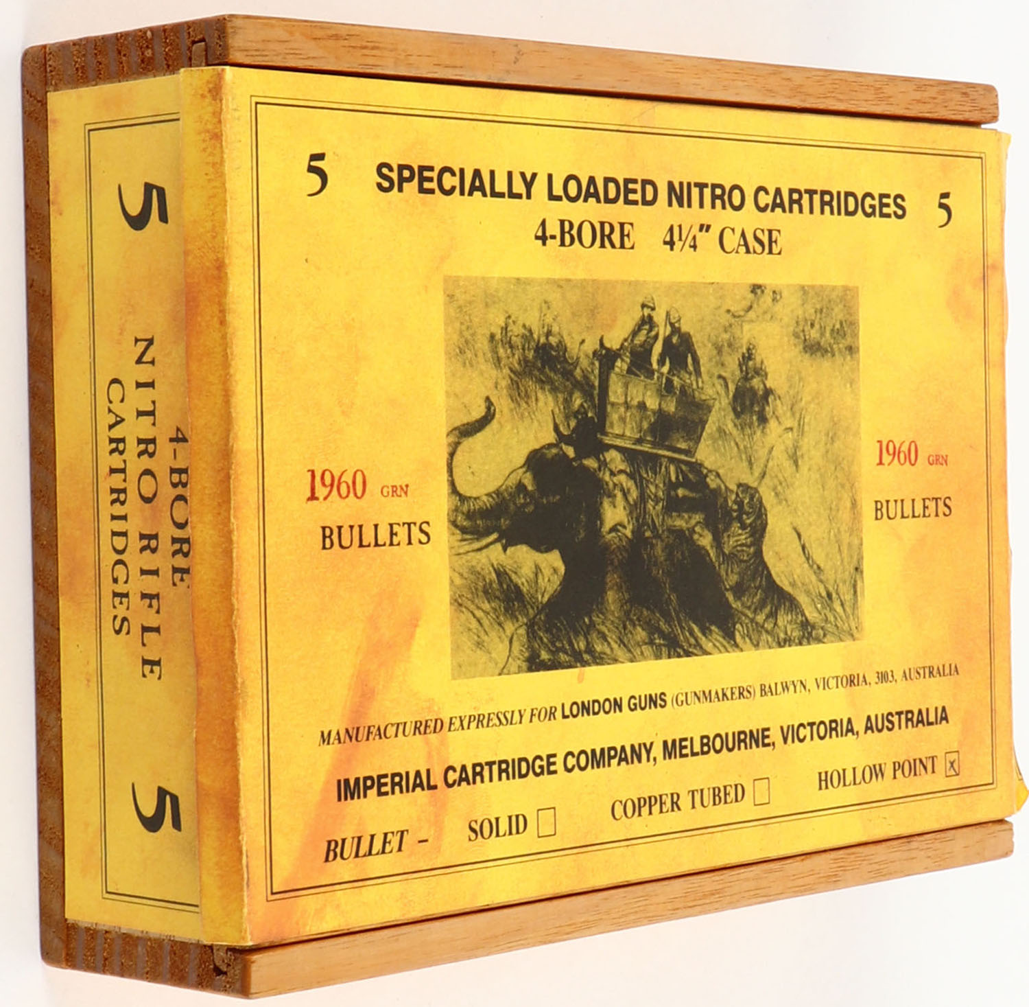 Imperial Cartridge Company, Specially Loaded Nitro Cartridges, 4-Bore, 4 1/4'' Case, 1960 Grain Bullets, Partial 1rd. 2pc. Wood box with yellow & black wraparound reproduction(?) label, box is solid with very good to excellent color, the cartridges case has been written on, and the lead appears to have been coated in a protective white paint. Grade: Very Good ++ - Value: 200 to 600