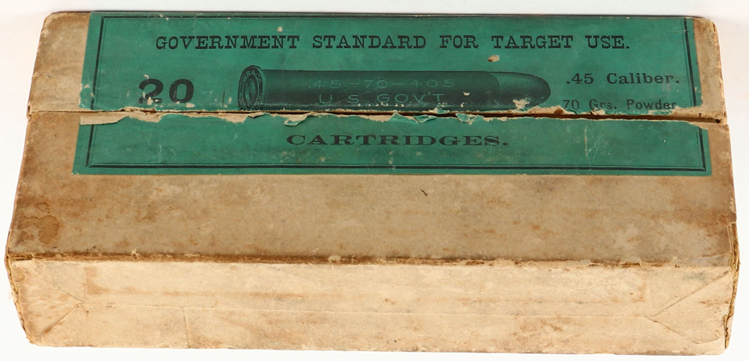 Winchester, Central Fire Cartridges, .45-70-405 U.S. Gov't, Extra Heavy Solid Head, Partial 11rds., 2pc. Buff box with green label, box is solid with very good color, some age soiling & corner wear, left end has been written on, minor edge wear, label is solid, ammo is excellent. Grade: Very Good ++ - Value: 30 to 90