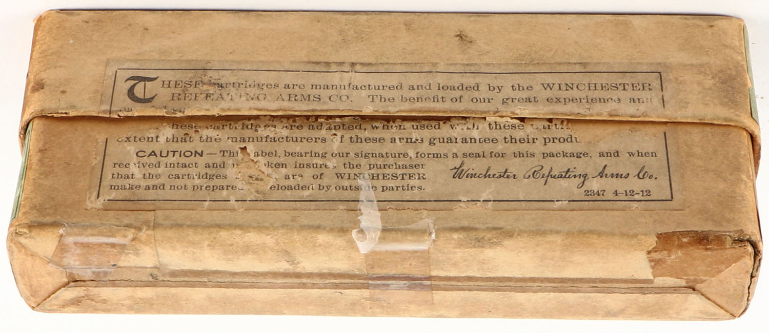 Winchester, Center Fire Cartridges, .40-60 Winchester, 210 Grain Bullet, Full, 1pc. Buff box with green & orange labels, box is solid with very good color, some color fading & shelf wear, some edge & corner wear, labels are intact, ammo is excellent. Grade: Excellent - Value: 80 to 240