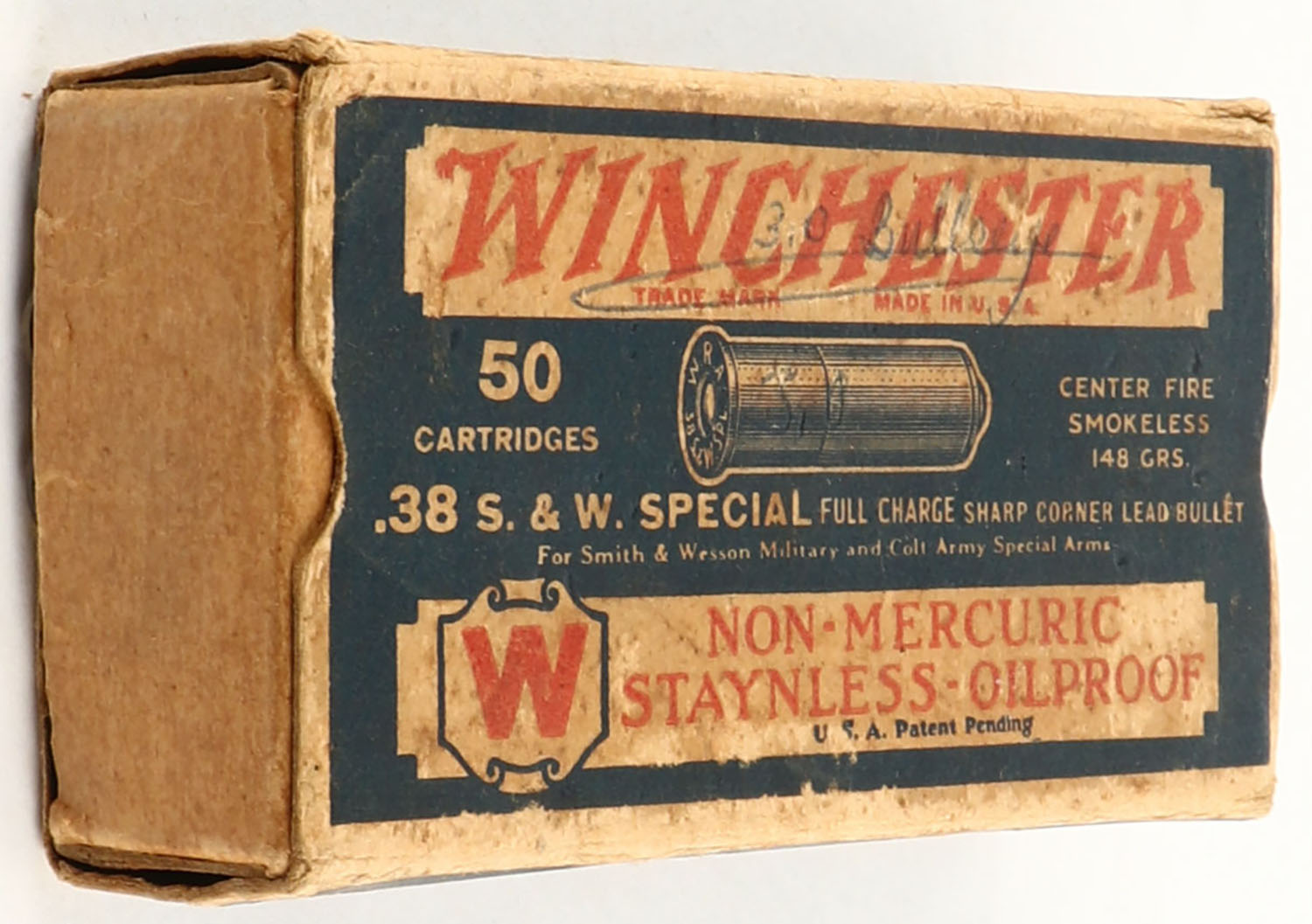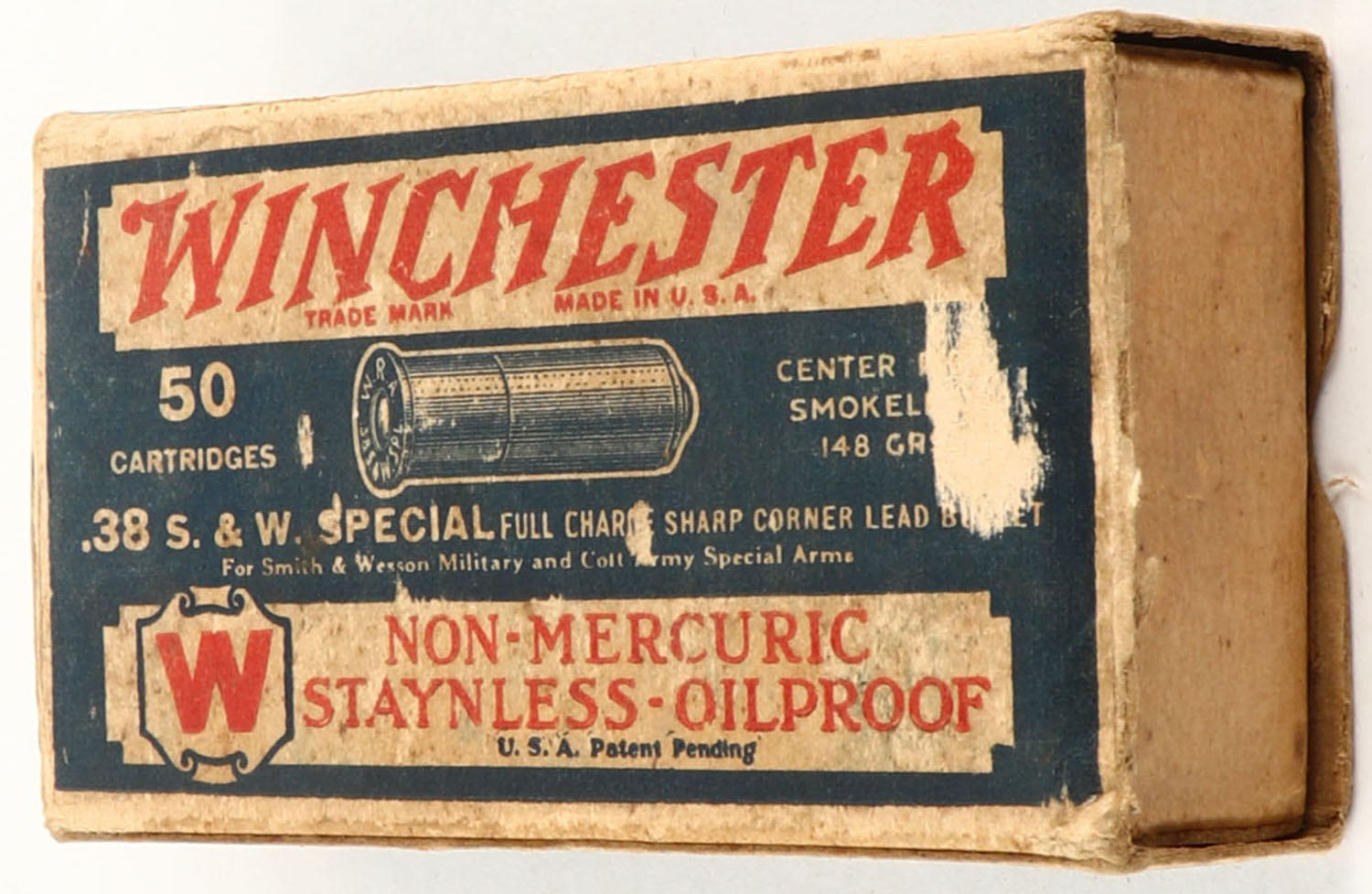 Winchester, Non-Mercuric Staynless - Oilproof, .38 Smith & Wesson Special, Full Charge Sharp Corner Lead Bullet, Empty, 1pc. Blue white & red box, box is missing both end flaps, very good color, some age soiling & shelf wear, some edge & corner wear. Grade: Good - Value: 6 to 30