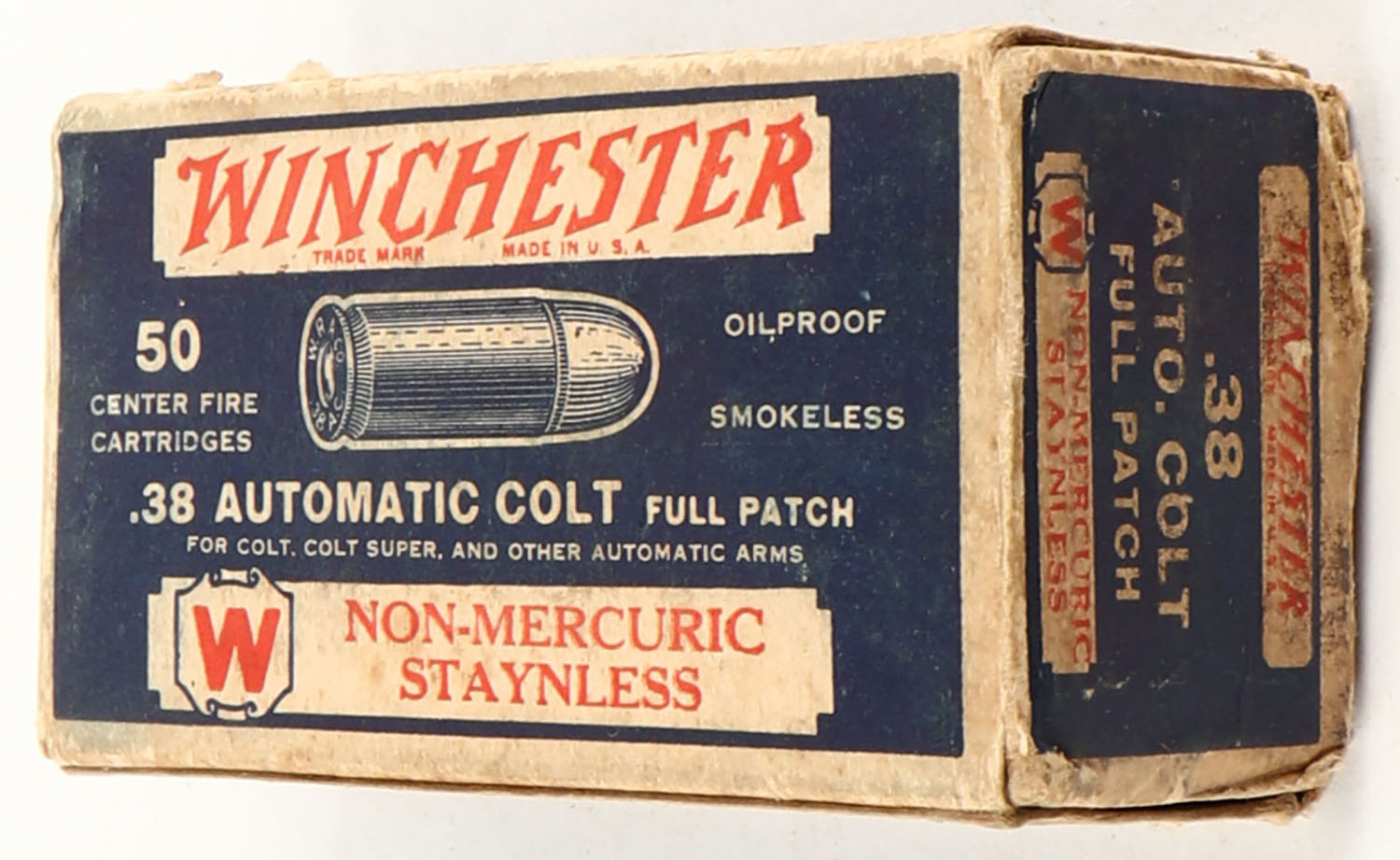 Winchester, Non-Mercuric Staynless, .38 Automatic Colt, Smokeless, Full Patch, Partial 47rds., 1pc. Blue white & red box, insert tab of right end flap is torn & taped, partial seam split to top front edge, edge & corner wear, left end flap is solid, ammo is excellent. Grade: Good ++ - Value: 20 to 80