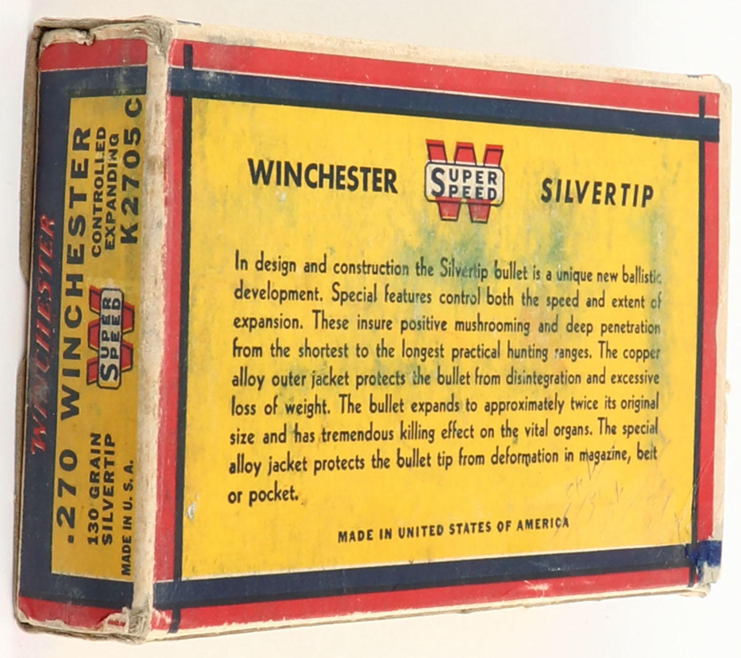 Winchester, Silvertip, .270 Winchester, 130 Grain Controlled Expanding Bullet, Full, 1pc. Yellow blue & red bear box, box is solid with very good color, some age soiling & shelf wear, corner wear, very minor edge wear, end flaps are solid, ammo is excellent. Grade: Very Good ++ - Value: 20 to 80