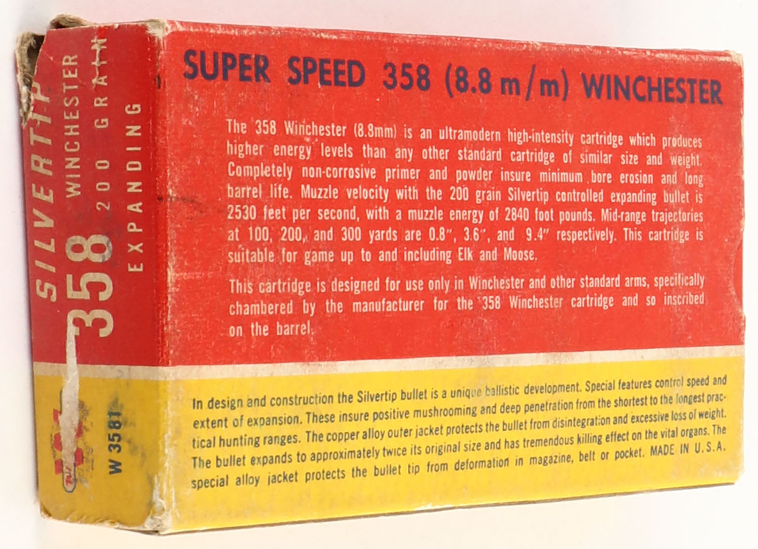 Winchester, Silvertip Super Speed, .358 Winchester (8.8mm), 200 Grain Controlled Expanding Bullet, Full, 1pc. Red yellow & white box, box is solid with excellent color, minor age soiling & shelf wear, minor corner wear, very minor edge wear, end flaps are solid, ammo is excellent. Grade: Excellent - Value: 40 to 120