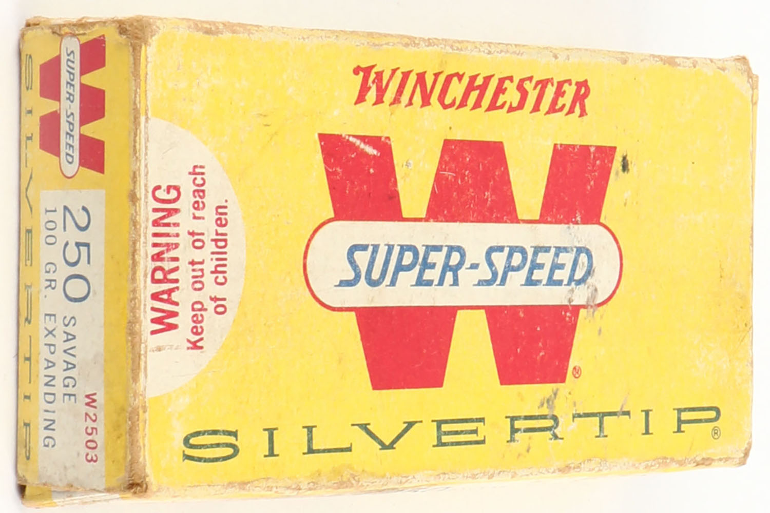 Winchester, Super-Speed Silvertip, .250 Savage, 100 Grain Expanding Bullet, Full, 1pc. Yellow white & red box, box is solid with very good color, some age soiling & shelf wear, edge & corner wear, end flaps are solid, ammo is excellent. Grade: Very Good + - Value: 20 to 60
