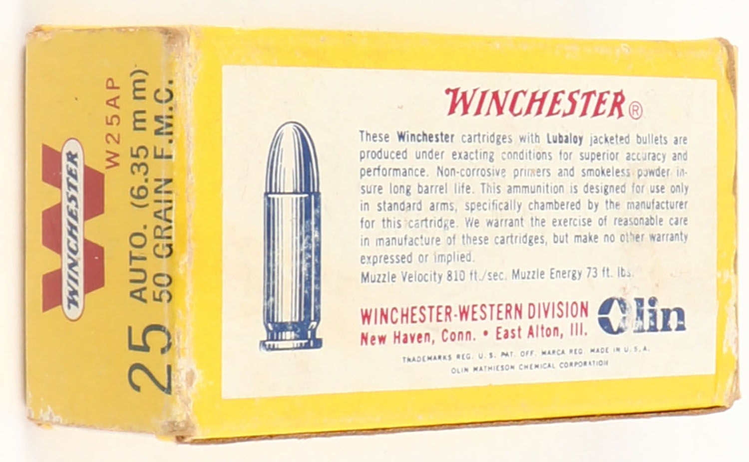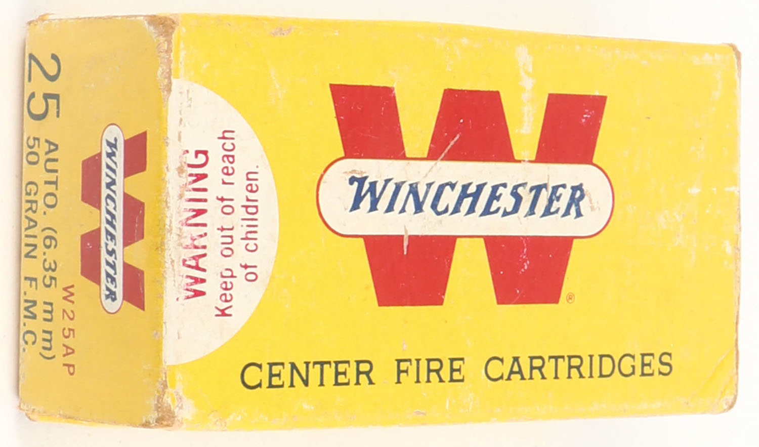 Winchester, Center Fire Cartridges, .25 Automatic (6.35 mm) 50 Grain Full Metal Case, Full, 1pc. Yellow white & red box, box is solid with excellent color, very minor shelf wear, some corner wear, edges are mostly crisp, end flaps are solid, ammo is excellent. Grade: Excellent - Value: 20 to 60