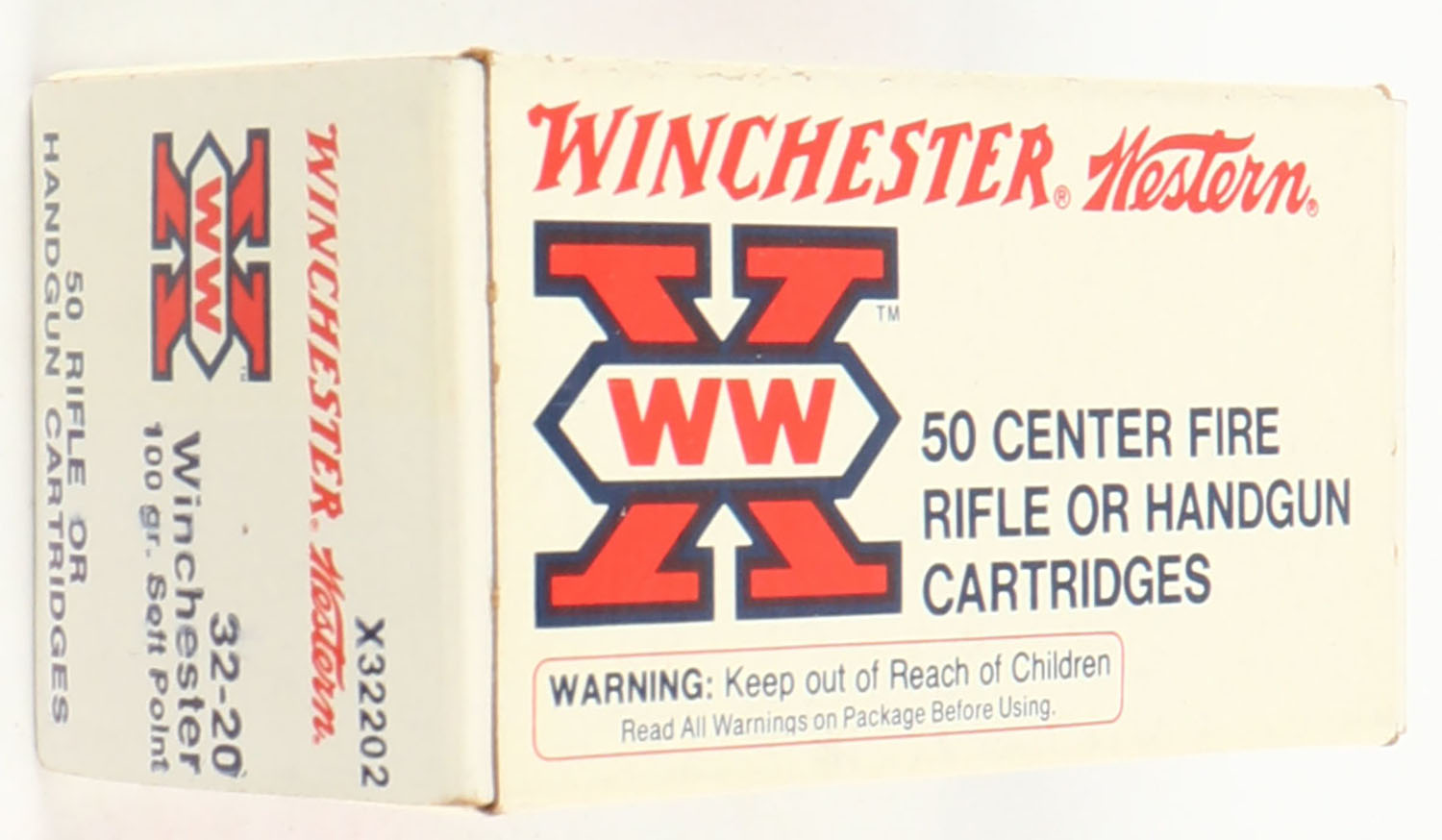 Winchester-Western, X, .32-20 100 Grain Soft Point, Full, 1pc., white box, is solid with excellent color, some ink writing on one side, corners are sharp, edges are crisp, end flaps are solid, ammo is excellent. Grade: Excellent - Value: 40 to 120