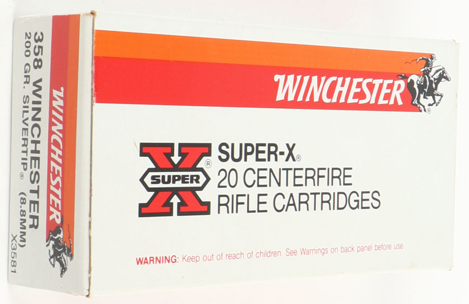 Winchester, Super-X, .358 Winchester, 200 Gr. Silvertip, Full, 1pc. Gray red & orange box, box is MINT with minty color, corners are sharp, edges are crisp, end flaps are solid, ammo is excellent. Grade: MINT - Value: 30 to 90