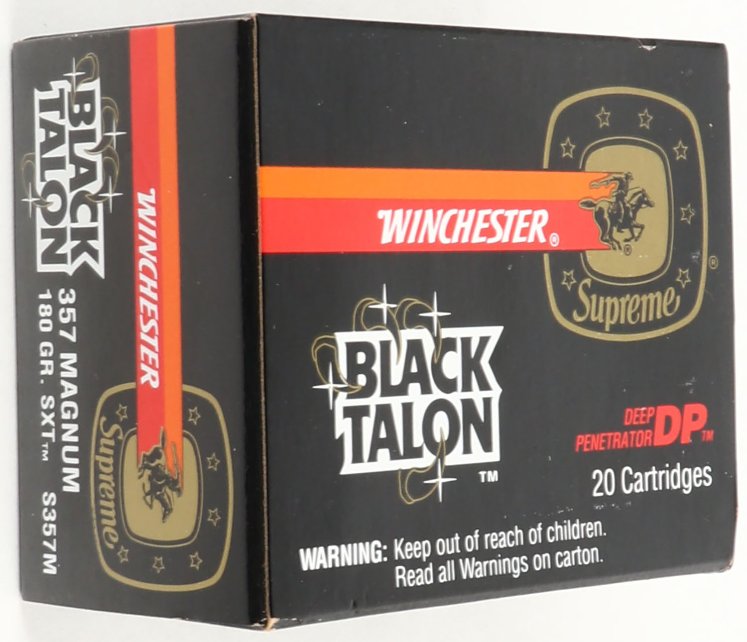 Winchester, Black Talon, .357 Magnum, 180 Gr. SXT, Full, 1pc. Black red & orange box, box is solid with excellent to minty color, minor shelf & corner wear, edges are crisp, end flaps are solid, ammo is minty. Grade: MINT - Value: 40 to 120