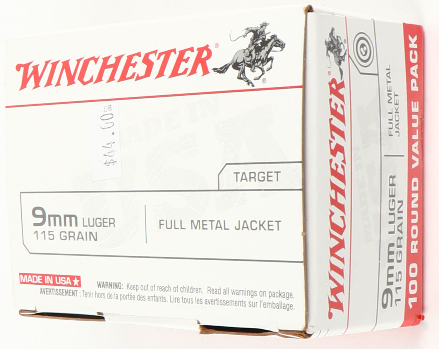 Winchester, 100 Round Value Pack, 9mm Luger, 115 Grain Full Metal Jacket, Full, 1pc. White & red box, box is near mint with minty color, only minor corner wear, top flap is solid, ammo is minty. Grade: Excellent ++ - Value: 20 to 60