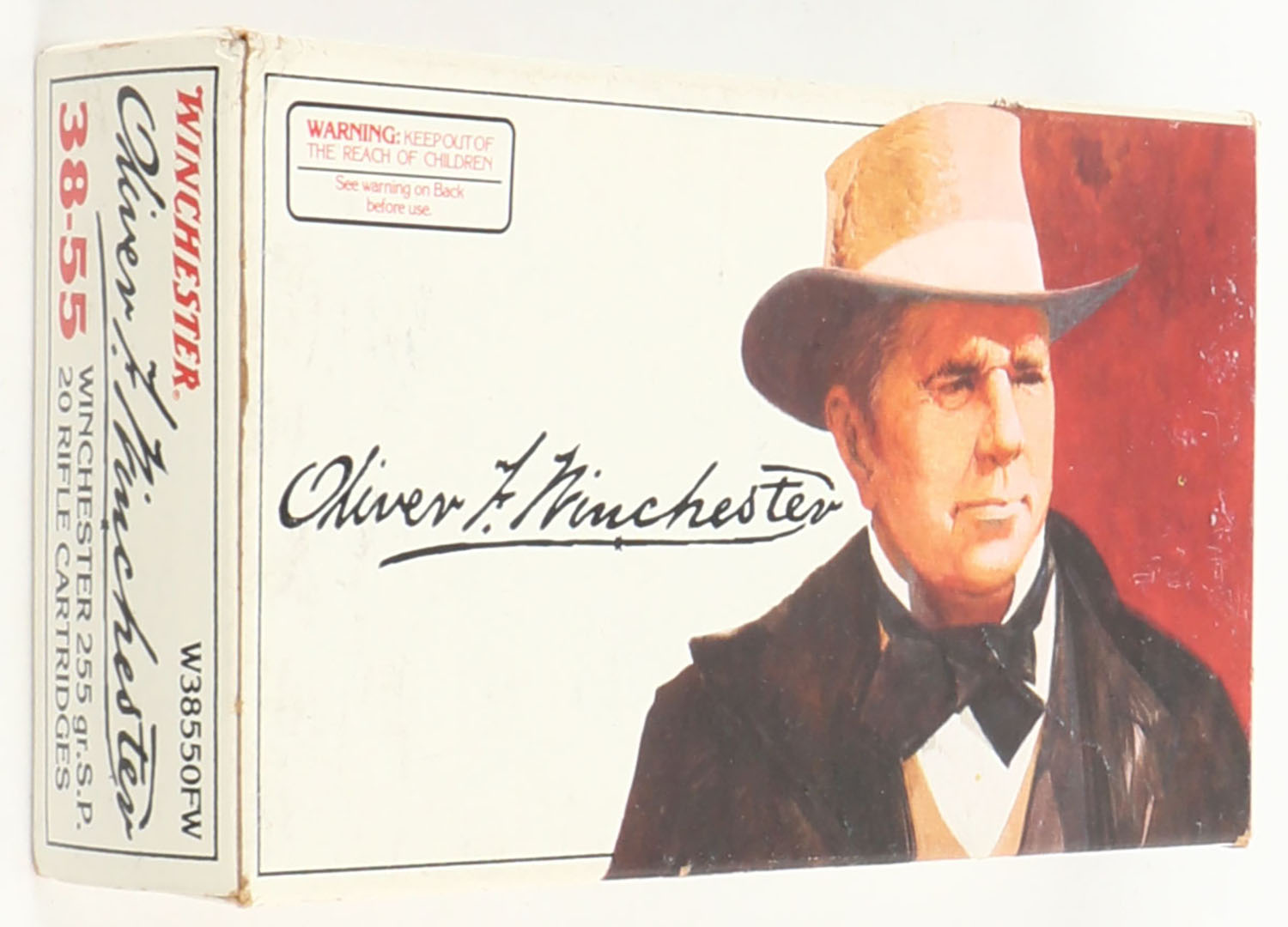 Winchester, Oliver F. Winchester, .38-55 Winchester, 255 Grain Soft Point, Full, 1pc. White box picturing Oliver Winchester, box is solid with excellent color, very minor shelf & corner wear, edges are mostly crisp, end flaps are solid, ammo is excellent. Grade: Excellent + - Value: 30 to 90