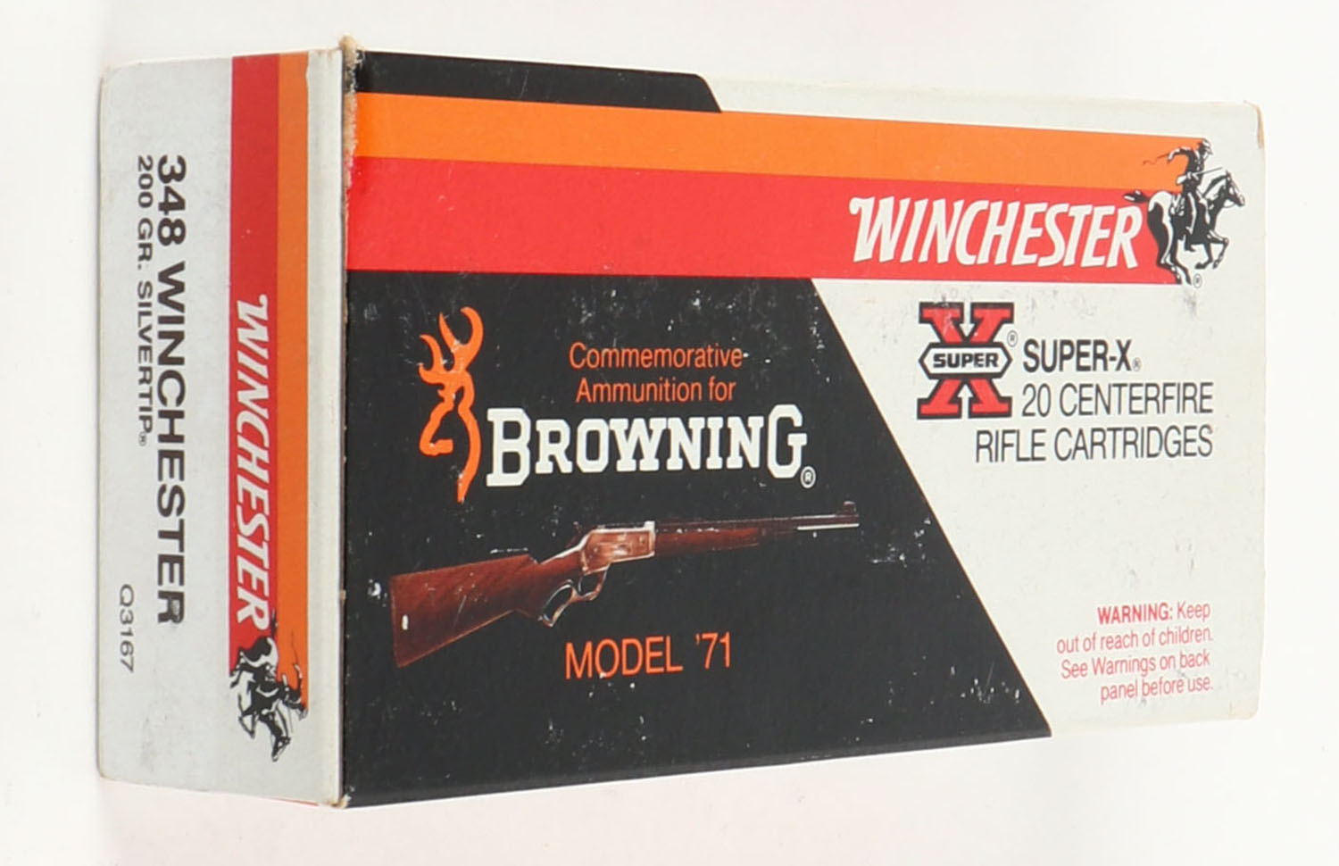 Winchester, Commemorative Ammunition for Browning Model '71, .348 Winchester, 200 Grain Silvertip, Full, 1pc. White & black box, box is solid with excellent color, some shelf & corner wear, edges are mostly crisp, end flaps are solid, ammo is excellent. Grade: Excellent + - Value: 40 to 120