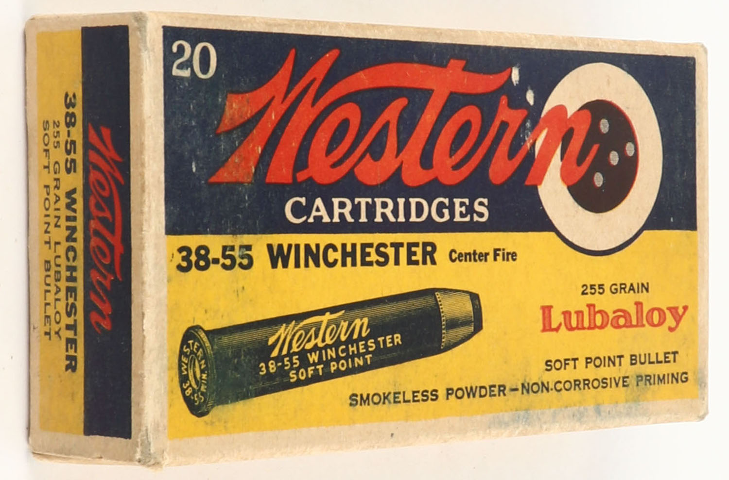 Western, Lubaloy Cartridges, .38-55 Winchester, 255 Grain Soft Point Bullets, Full, 1pc. Yellow blue & red bulls eye box, box is solid with very good to excellent color, some shelf & corner wear, very minor edge wear, end flaps are solid, ammo is excellent. Grade: Very Good ++ - Value: 30 to 90