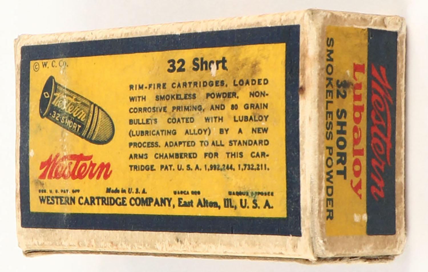 Western, Lubaloy Cartridges, .32 Short Rim Fire, 80 Grain Coated Bullet, Full, 1pc. Yellow blue & red bulls eye box, left end flap is torn & taped, very good color, some age soiling & staining, minor edge & corner wear, right end flap is solid, ammo is very good. Grade: Very Good - Value: 40 to 120