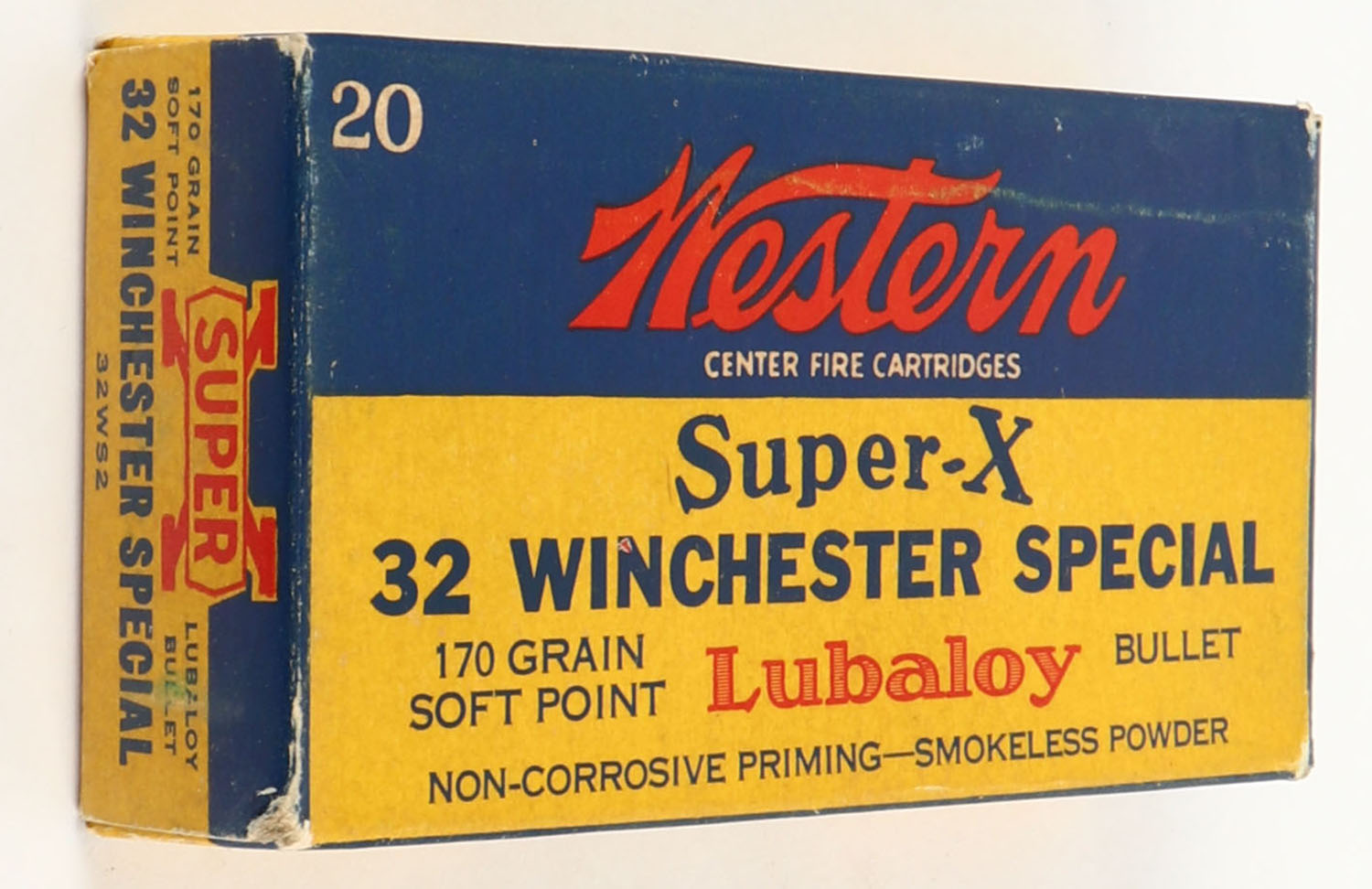 Western, Super-X, .32 Winchester Special, 170 Grain Soft Point Lubaloy Bullet, Full of fired brass, 1pc. Yellow blue & red box, box is solid with excellent color, minor corner wear, edges are mostly crisp, end flaps are solid, brass is excellent. Grade: Excellent + - Value: 10 to 50