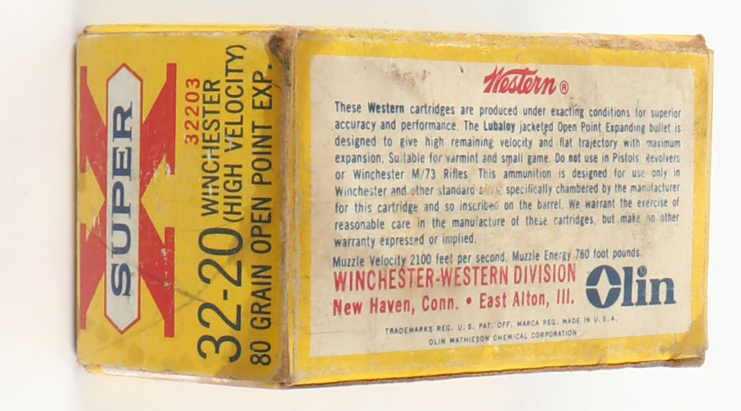 Western, Super X, .32-20 Winchester, 80 Grain Open Point Expanding, Partial 36rds., 1pc. Yellow white & red box, box is solid with very good color, staining all over box, some corner wear, minor edge wear, end flaps are solid, ammo is excellent. Grade: Very Good + - Value: 20 to 60