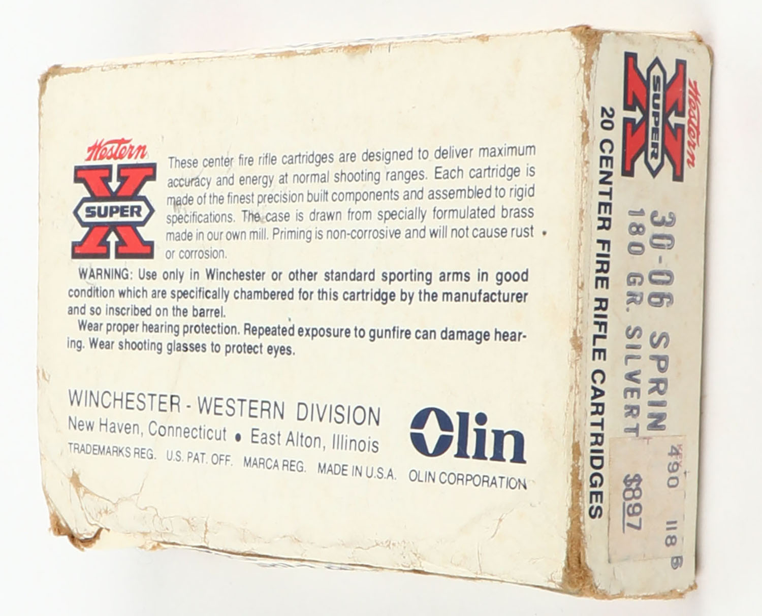 Western, Super X, .30-06 Springfield, 180 Grain Silvertip Expanding, Full, 1pc. White red & blue box, box is solid with very good color, minor age soiling, corner wear, minor edge wear, end flaps are solid, ammo is excellent. Grade: Very Good ++ - Value: 10 to 40