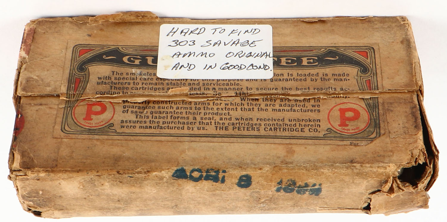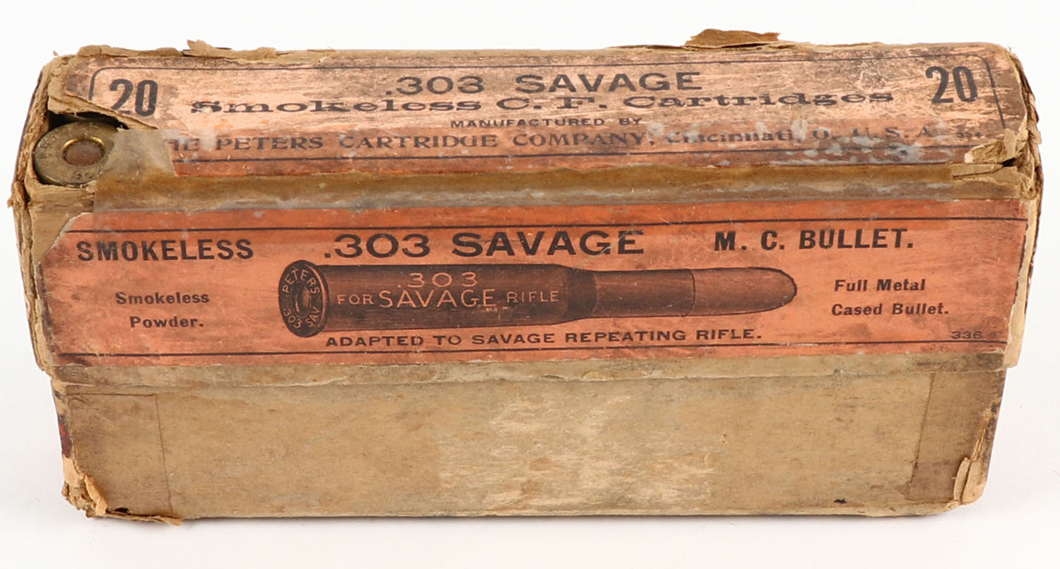Peters, Smokeless C.F. Cartridges, .303 Savage, Smokeless Powder, Full Metal Cased Bullet, Full, 2pc. Buff box with orange labels, box is solid with good color, age soiling, hole on top of lid, holes in both ends of bottom, corner wear, some edge wear, labels are intact, ammo is excellent. Grade: Very Good - Value: 20 to 60