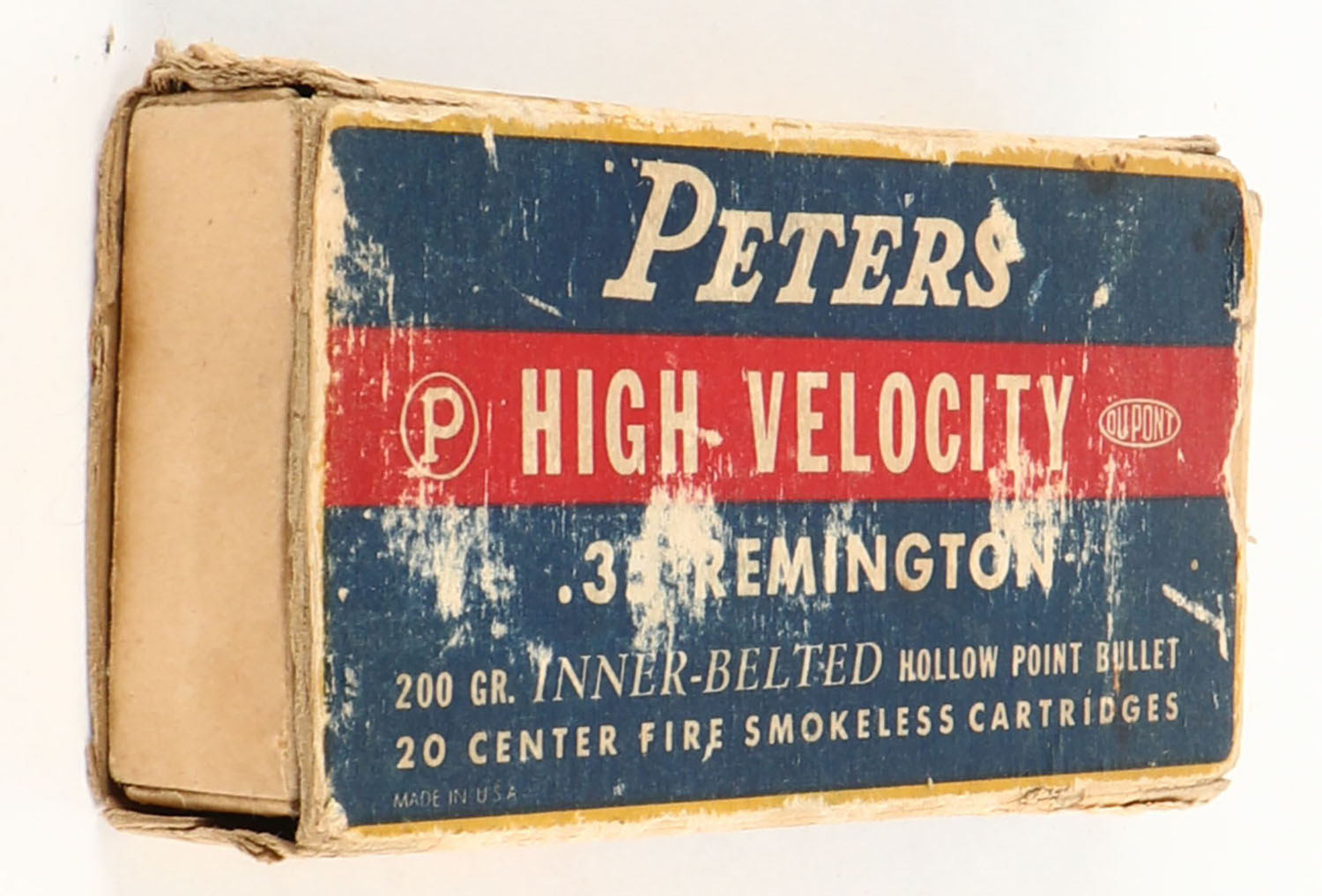 Peters, High Velocity, .35 Remington, 200 Grain Inner-Belted Hollow Point Bullet, Partial 12rds., 1pc. Blue yellow & red box, box is missing both end flaps, good color, minor age soiling, shelf wear, tape on front & bottom, edge & corner wear, ammo is good. Grade: Fair ++ - Value: 6 to 30